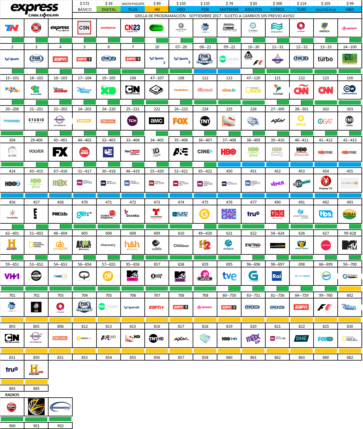 Disculpen las molestias, pero hubo un retraso porque aún no tengo las ubicaciones de Fox Sports Premium y de TNT Sports. Tampoco tengo el nuevo logo de CN23. Eso sí, el costo del paquete de fútbol está disponible. Para ver el fútbol es necesario 1 luca entera. Hasta ahora la grilla es la misma que el mes anterior