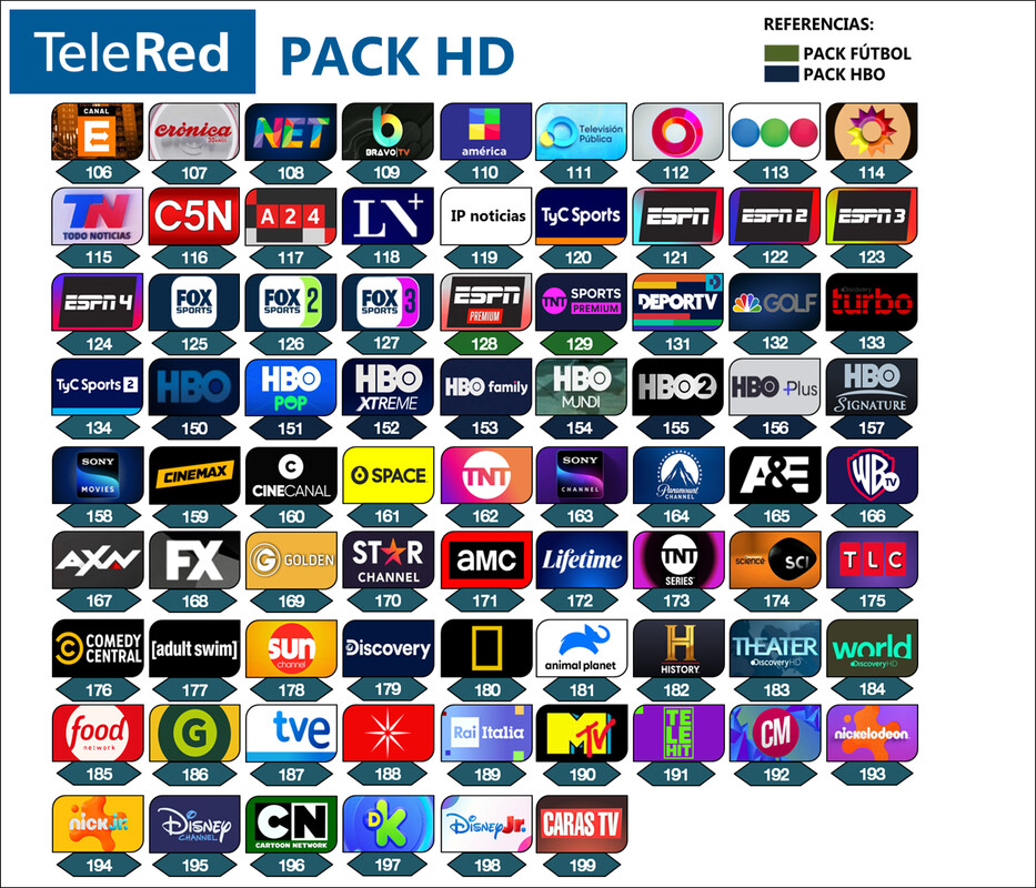 Resulta llamativo que aún mantengan una franja exclusiva para los canales HD, cuando hoy en día todos se transmiten en simulcast SD/HD. Esto podía entenderse hace diez años, cuando el feed en SD y en HD convivían como señales independientes. TeleRed, DirecTV y Telecentro aún siguen en esta movida.