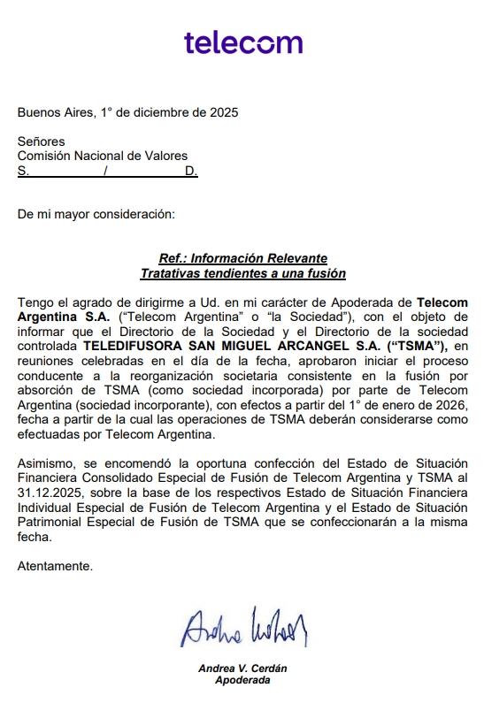 Antes de arrancar, informamos que el mes próximo, se fusionan administrativamente las firmas entre Telecom y Teledifusora San Miguel Arcángel S. A. (Ver cita)