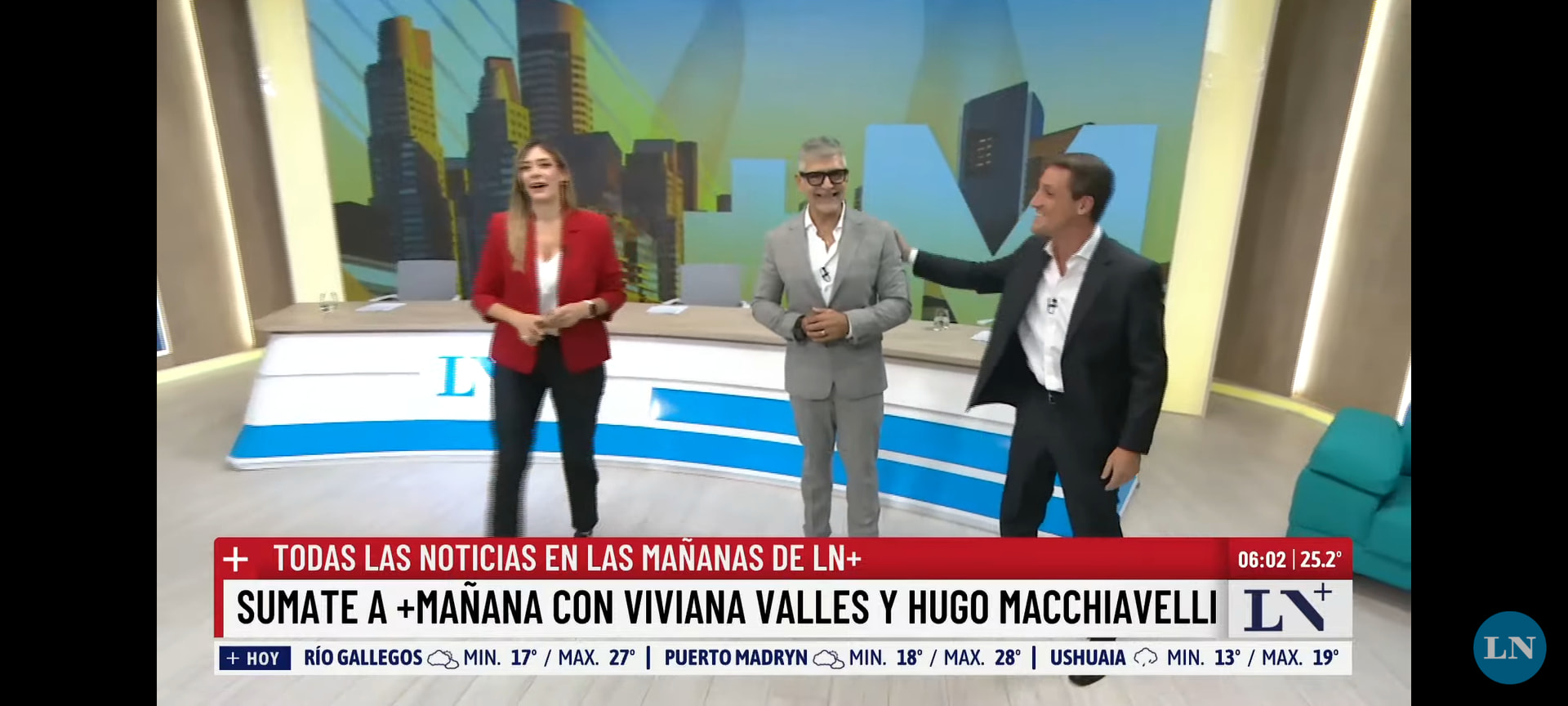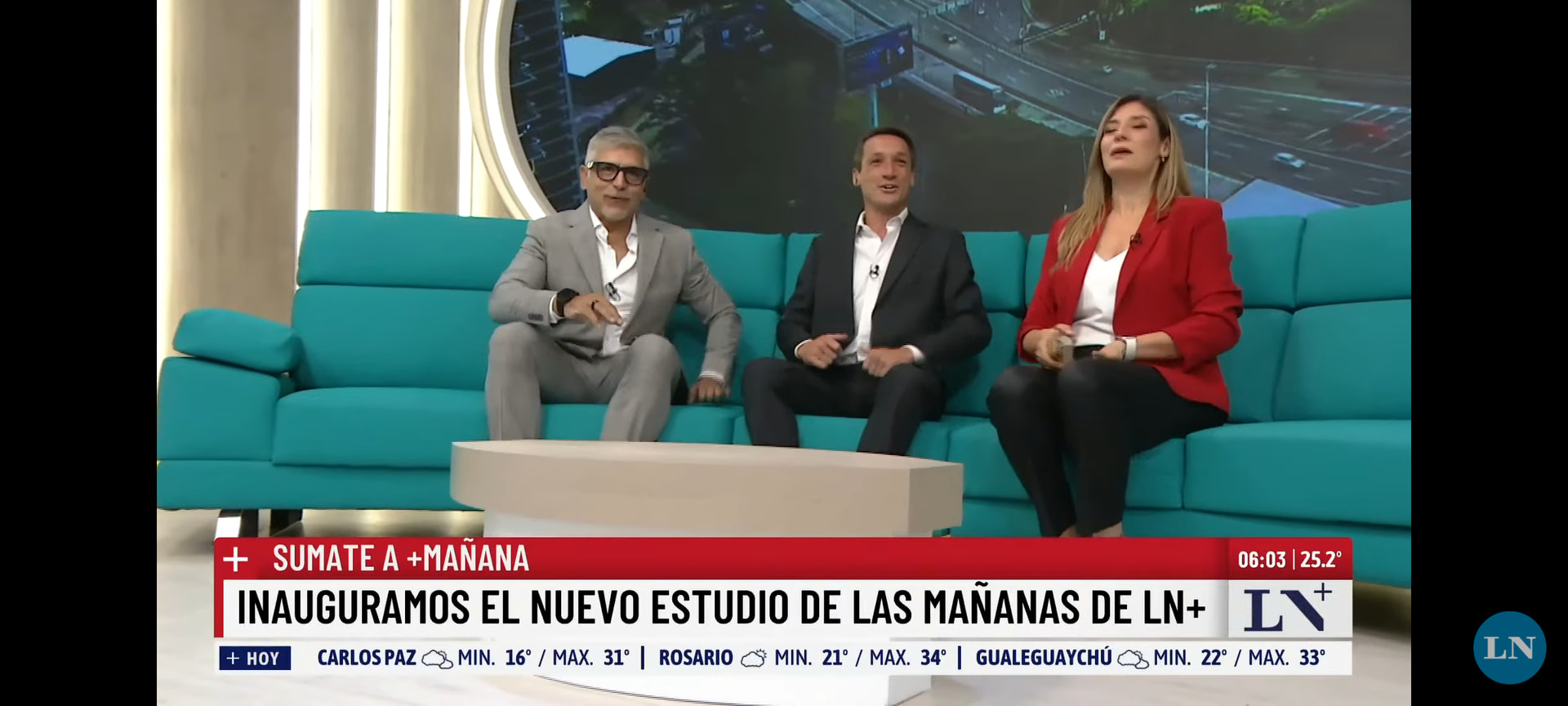 LN+ alquiló otro estudio de La Corte, ubicado al fondo de la productora justo arriba de la redacción, las islas de edición y el CAE (Centro de Arte Electrónico). Armaron una escenografía moderna con maderas, luces LED y sillón living, que se usará sólo para los programas de la mañana. En este caso arrancan con +Mañana con Hugo Macchiavelli y Viviana Valles. También hay títulos cada media hora. Además se incorporó al panel Andrés Chirinos, ex Canal 26 y actualmente en DNews, quien ya era invitado habitual a LN+.