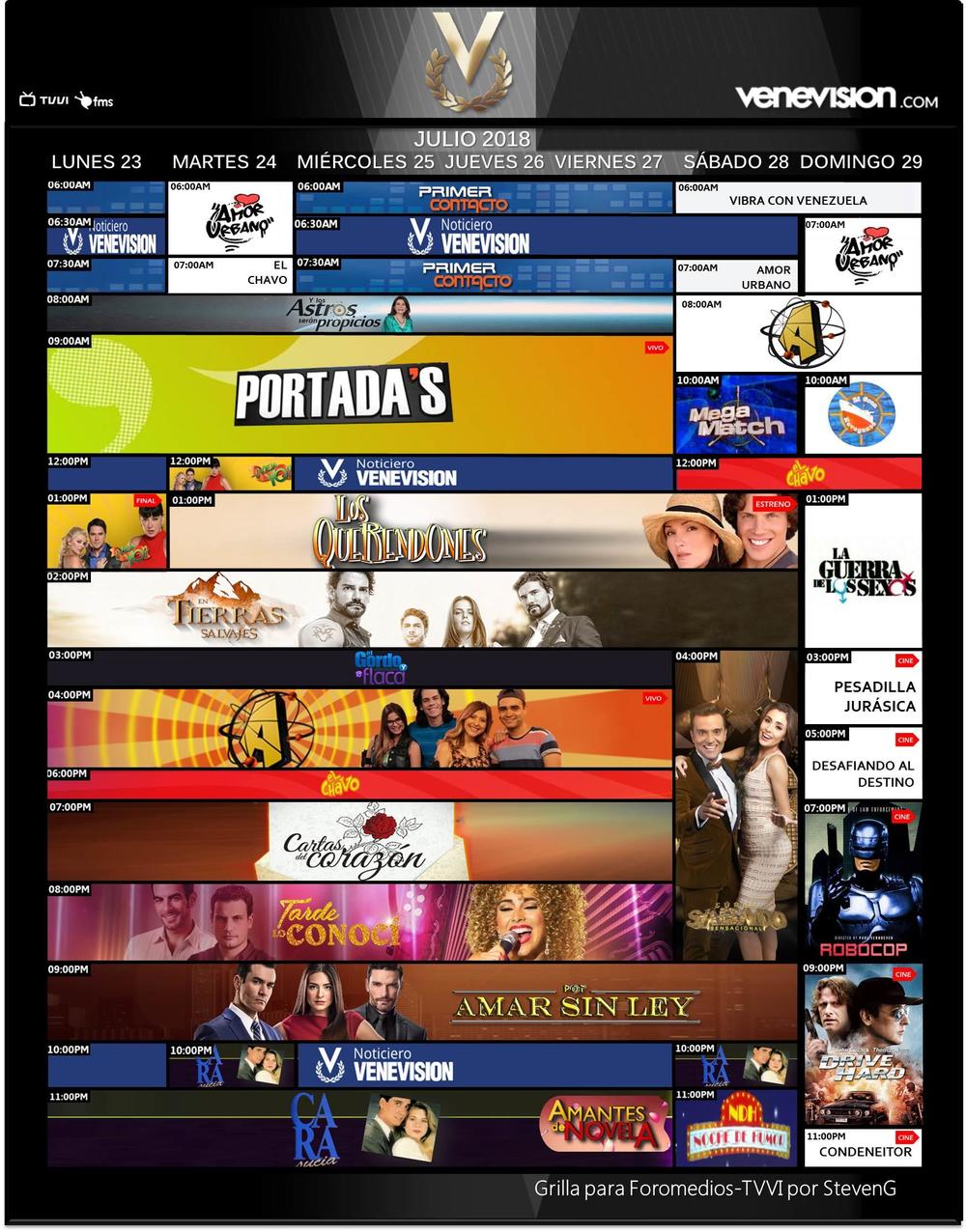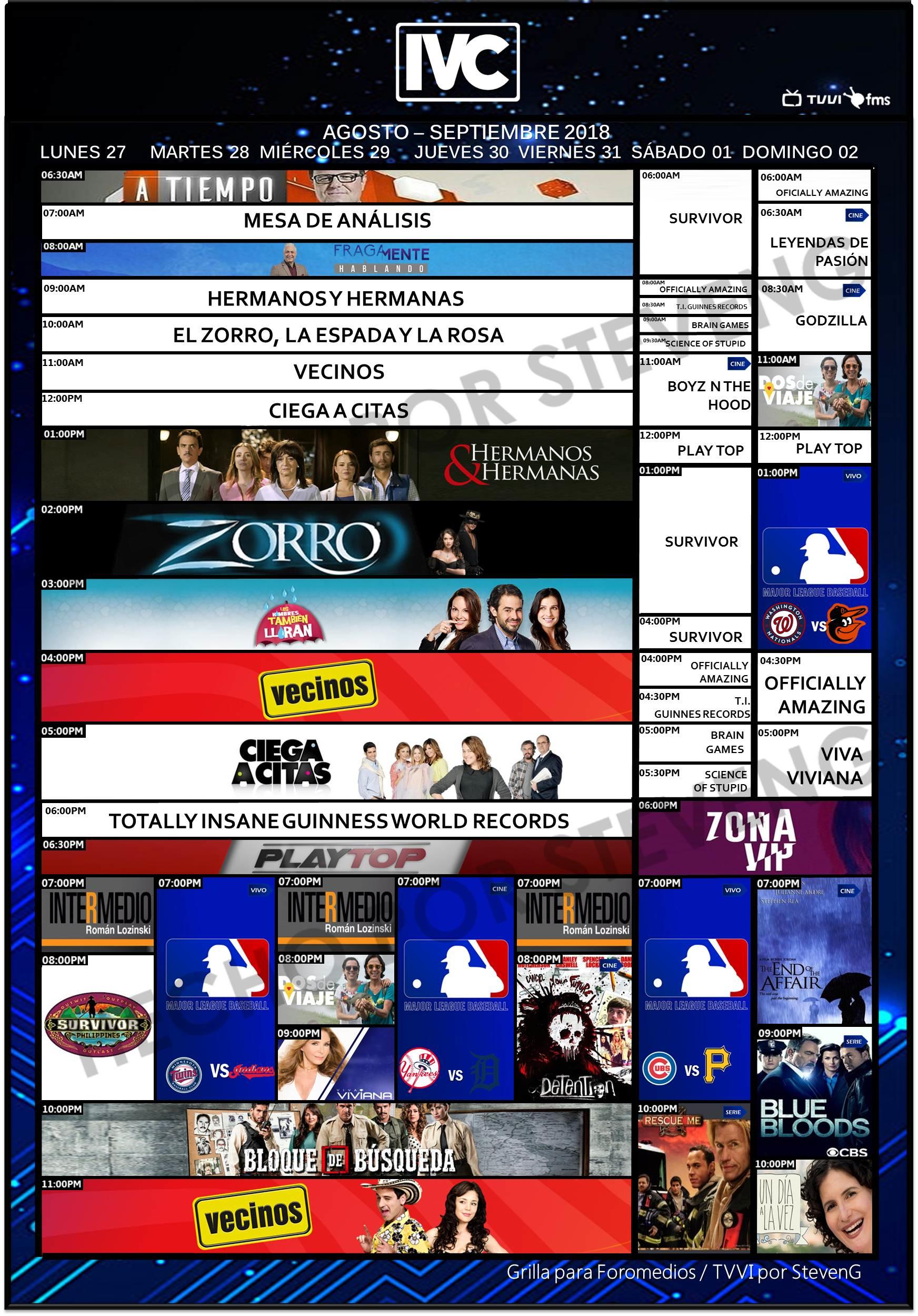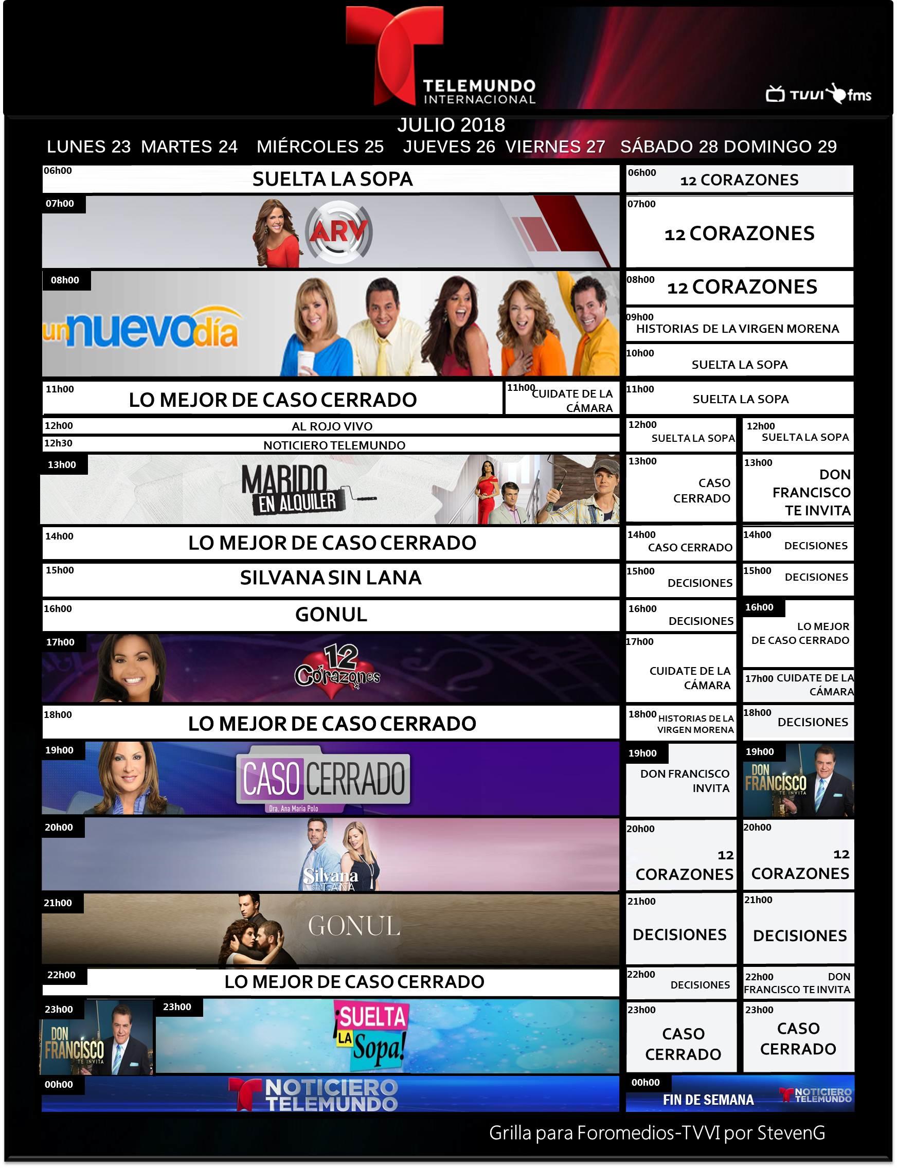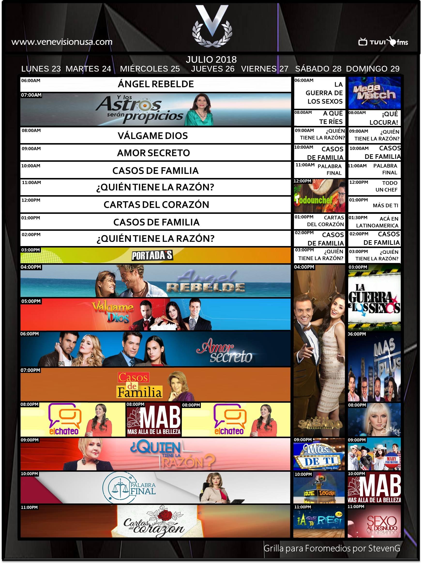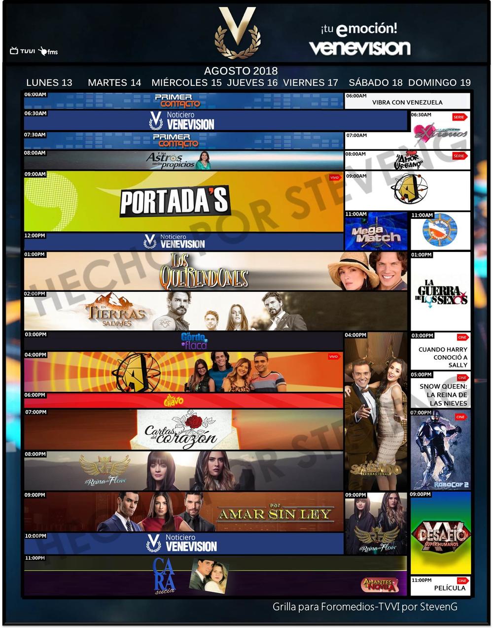 [](https://cdn.storage.foromedios.com/monthly_2018_08/560647926_Venevisinagosto012018.jpg.9eaab3d13ca607e84333136f1115bf70.jpg)[](https://cdn.storage.foromedios.com/monthly_2018_08/1731729918_Televenagosto012018.jpg.e9c0fdd9aac884db8fc19a8f73592b5f.jpg)[](https://cdn.storage.foromedios.com/monthly_2018_08/356663855_VenevisionPlusagosto012018.jpg.89ecf6020c6615ba1baf078d72248014.jpg)[](https://cdn.storage.foromedios.com/monthly_2018_08/457713600_IVCagosto012018.jpg.617e9168620c05577c7755f066f16183.jpg)[](https://cdn.storage.foromedios.com/monthly_2018_08/1581175106_TelemundoIntlagosto012018.jpg.f96d1ec3644e8adf50233fbe3dac851d.jpg)