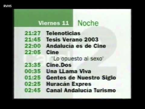Pondré el inicio y cierre de uno de los canales de los cuales estoy viendo sus comerciales y gráficas pasadas: Canal 2 Andalucía (actual Canal Sur 2, y su sucesora espiritual Andalucía Televisión). Como verán, ambos son en realidad lo mismo, solo que para contextualizar subiré con qué intención fueron emitidos: