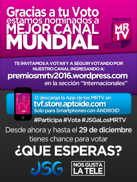 #JSGTVFicticia gracias a tu voto estamos nominados en la categoría de Mejor Canal Mundial en los Premios #MRTV2016, te invitamos a seguir participando a través de este enlace http://bit.ly/2eveO5a, tienes chance hasta el 29 de diciembre ¡¡¡Vamos Venezuela que si se puede!!!