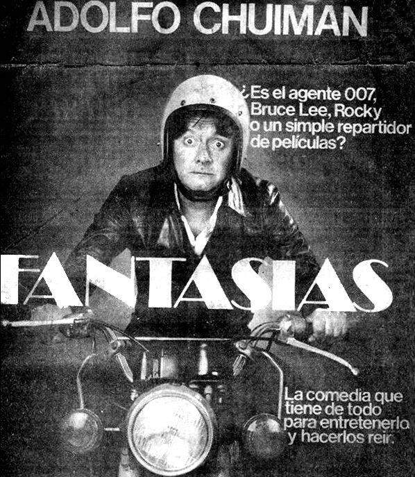 Publicidad que anunciaba una película de comedia protagonizada por Adolfo Chuiman titulada FANTASÍAS. Lo más alucinante de esta reliquia del cine peruano en general es que está considerada prácticamente perdida y no hay hasta el momento la revelación de algún testimonio adicional sobre quien mantiene una copia sobreviviente ¿Realmente era película para cine o era un telefilme? Cualquier aclaración de quienes sepan de este contenido, me lo hacen saber.