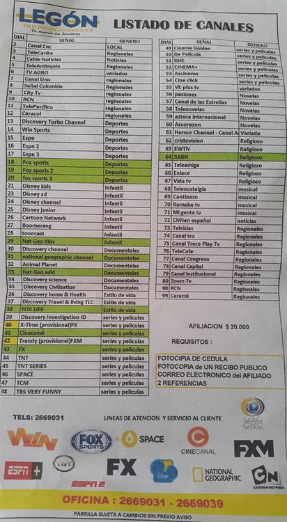 Gentes! estaba por Cadiz y me entregaron esta grilla ya completamente diferente me sorprendí de lo buena que esta, y se ve que los canales Fox aun están en grilla verde ¿Sera que Ya. ingresaron?. y lo mejor aun 20 mil pesos cerrados con suscripción gratis. A Ibagué este año entran pisando duro HV y Legon. Colcable nada que agrega canales ya lo alcanzaron ojala tenga sorpresas este año por que si subio tarifas. <