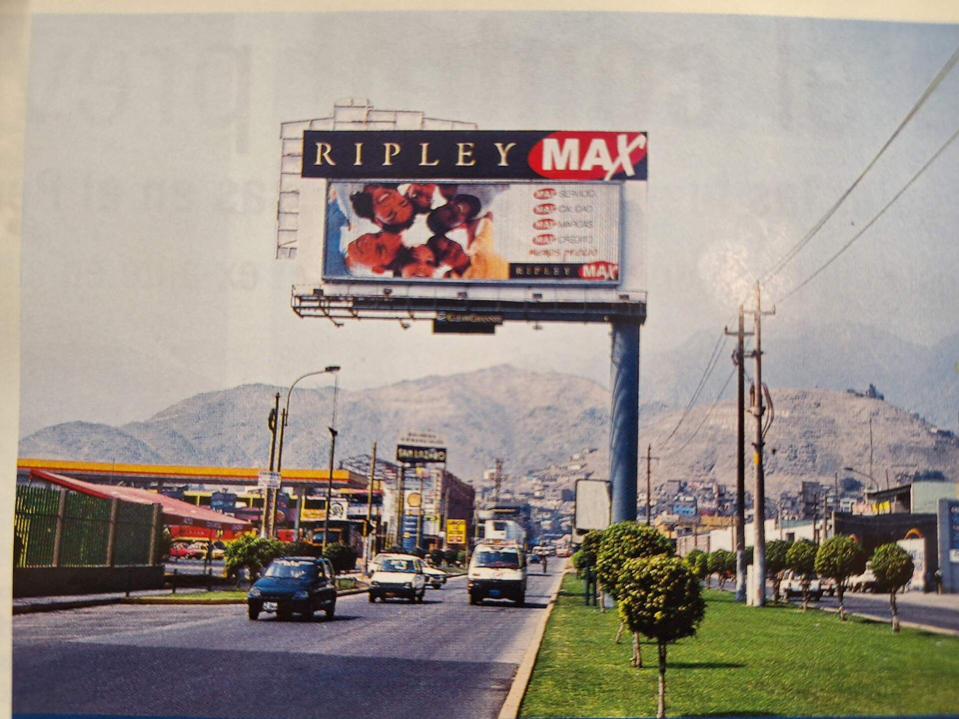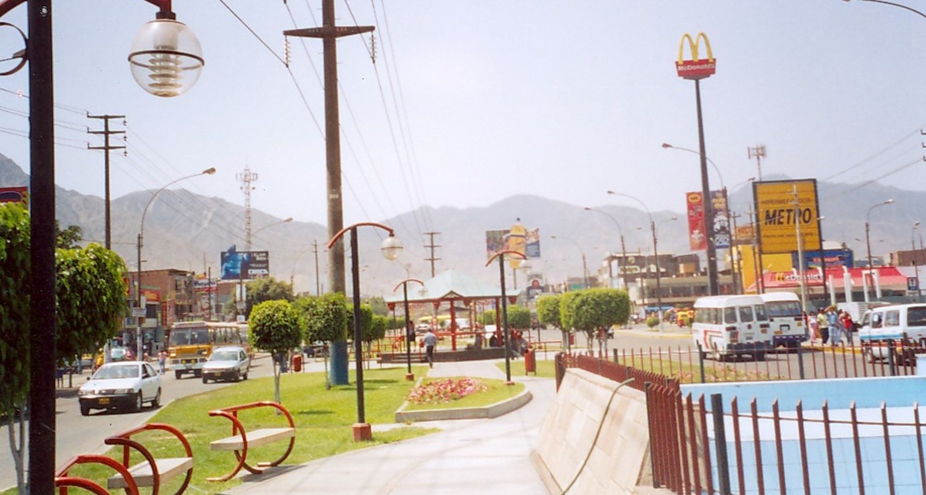 Vista de la Av. Próceres de la Independencia cerca al cruce con la Av. Los Jardines en el distrito de San Juan de Lurigancho, aprox. en el año 2003 o 2004. Se aprecia el antiguo bulevar de la zona, que dejó de existir tras la construcción de la Línea 1 del metro, hoy sobre el sitio está la estación Los Jardines. A la izquierda, letreros de algunos negocios como Bata, Pastipizza y el desaparecido instituto Cesca. Al fondo una publicidad de la gaseosa Oro y de la leche Gloria, así como la antigua fachada de la pollería Norky’s. A la derecha, el McDonald’s de la zona con una torre muy alta (después reducida) y el tótem de Metro con su antiguo logo.