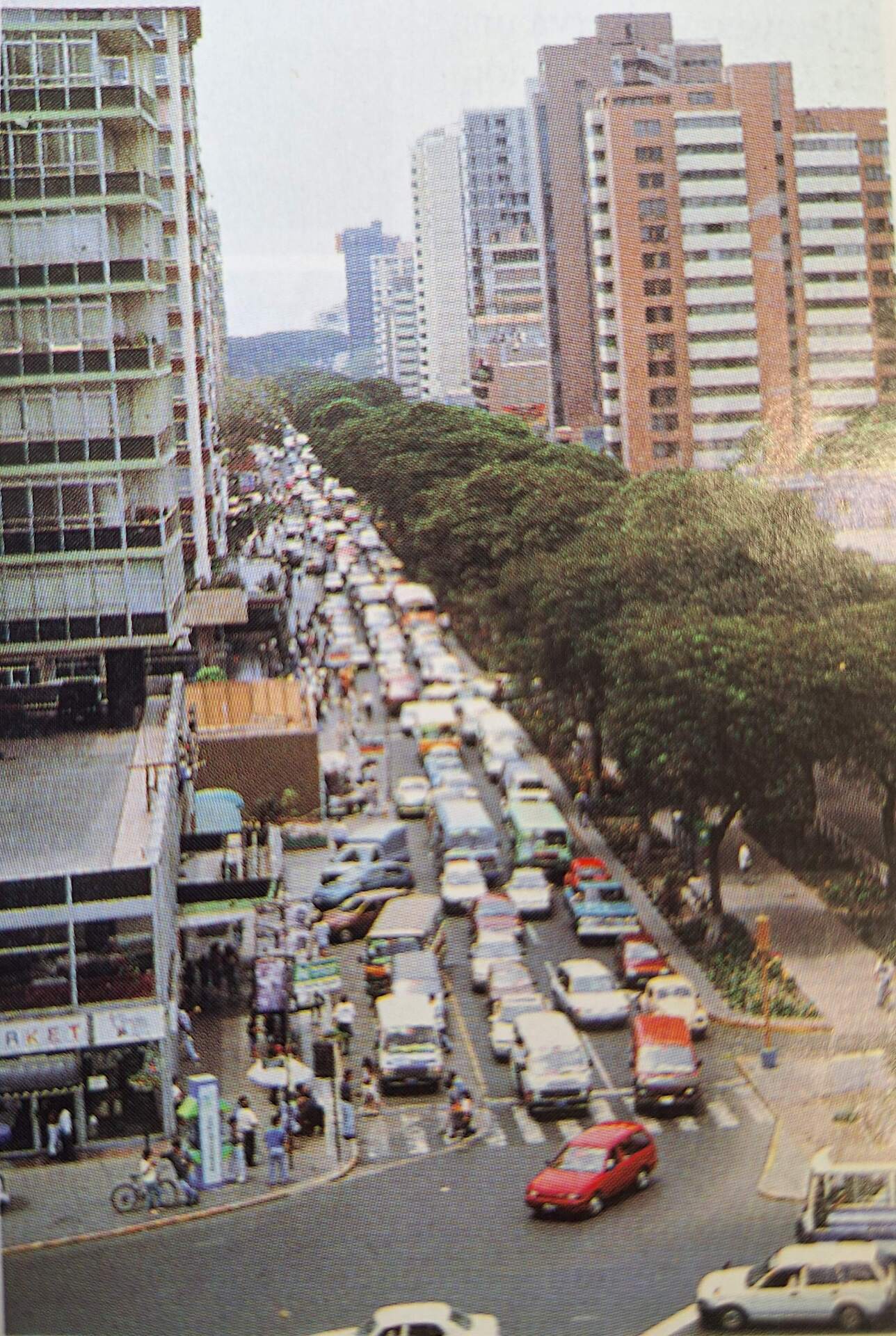 La Av. Pardo desde el Óvalo Central de Miraflores, sin año exacto pero diría que es entre 1995 y 1996 aprox., apareciendo varias combis y custers en transporte público contrastando con la mayoría de buses de la actualidad (o en todo caso minibuses). Se ve parte del recinto que ocupaba el Chifa Pacífico que en 1997 sería parcialmente reemplazado por el actual McDonald’s. También parte de la antigua tienda del piso de abajo que creo que estaba dedicada a regalos varios tipo Dollar City, desde 2007 una oficina del BCP. En la esquina también, un teléfono de Telefónica con la imagen de entonces.