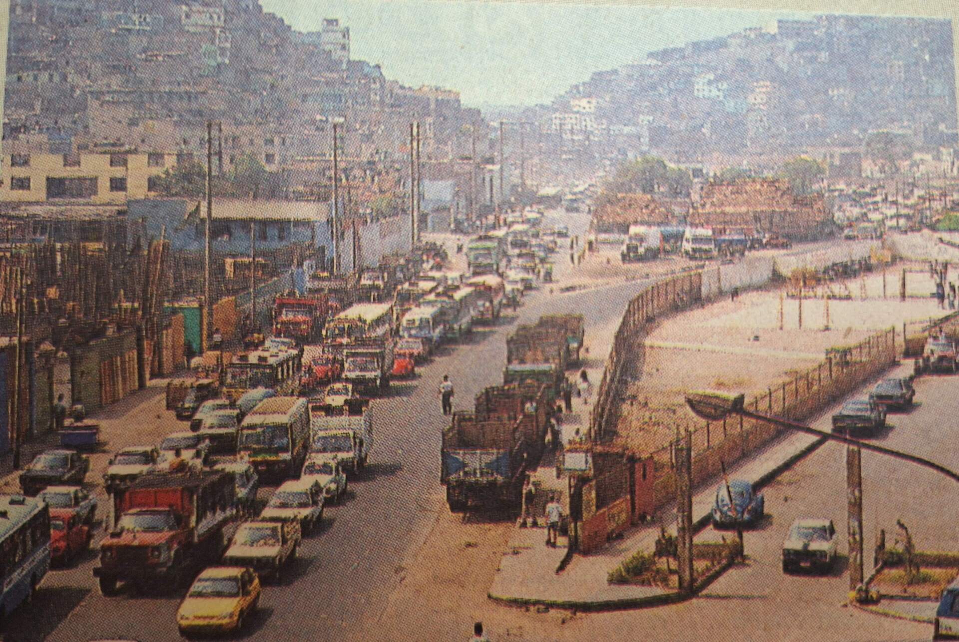 La Av. Nicolás Ayllón en el límite de los distritos de El Agustino y el Cercado de Lima, en abril del año 1997. Se observan los antiguos depósitos de los actuales mercados de frutas, aunque ya por entonces con bastante desorden. Al fondo se ven varias cajas de mercadería y algunos camiones para su transporte. Por la fecha, claramente aún no existía Elektra que abriría algunos años después en la esquina con la Av. Riva Agüero. A la derecha, la vieja cancha y los juegos de la urbanización Manzanilla y un parqueo con espacios sobrantes, hoy todo lo contrario. Fuente: El Comercio.