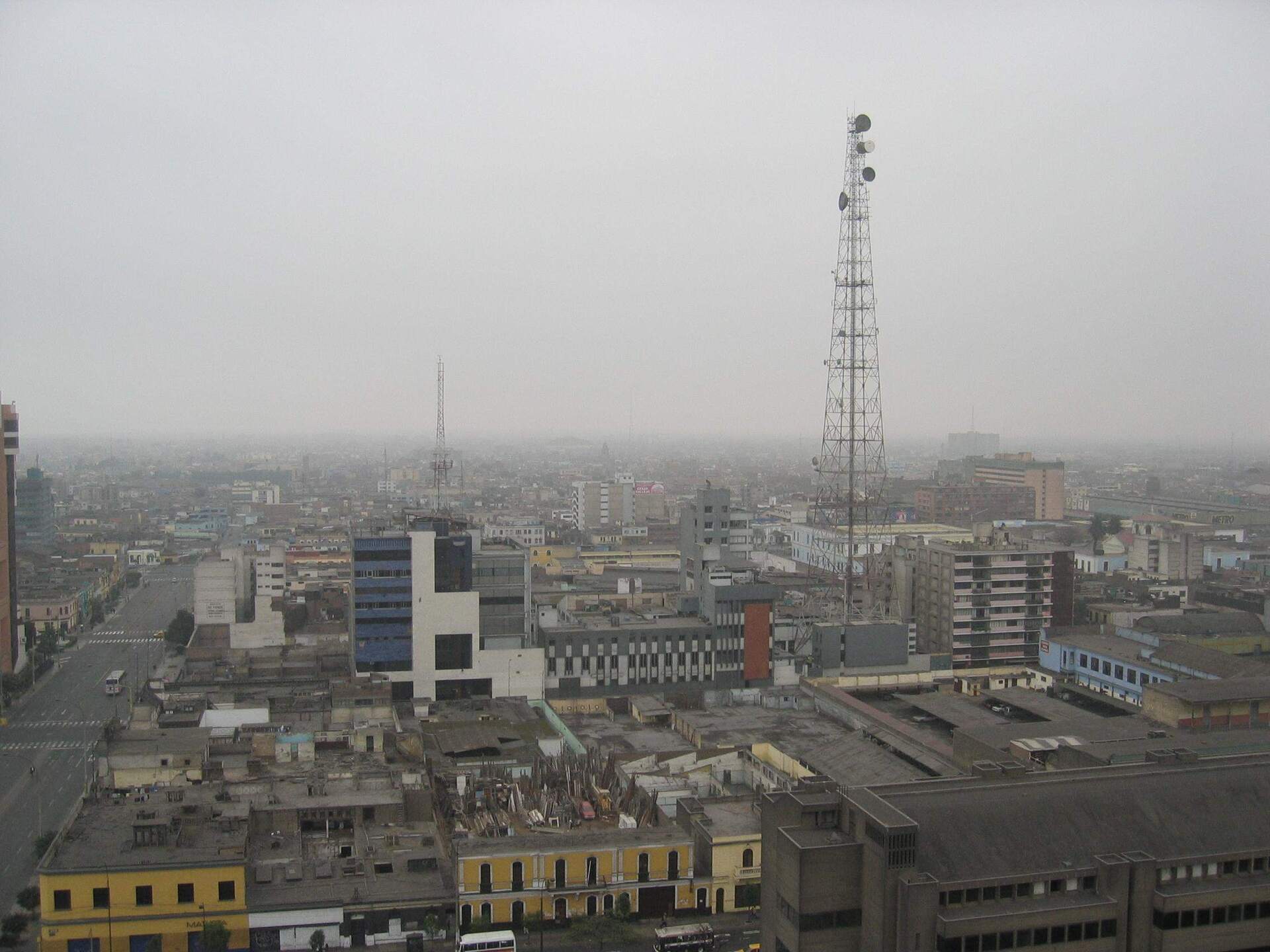 Vista mañanera desde el Hotel Sheraton hacia los distritos del Cercado de Lima y Breña, en un domingo de setiembre del año 2004. La hora y el día explican el poco tráfico. A la izquierda, la Av. España sin rastro de las vías del Metropolitano (apenas en planes estaba) y abajo parte de la casa Matusita sin negocios abajo aparentemente. Por ahí en la Av. Wilson se nota la casona de en medio como un depósito y al lado parte de otro edificio antiguo, años después llegaría el Cyber Plaza. A la derecha, se puede ver el hipermercado Metro de Alfonso Ugarte en sus últimos meses con la antigua fachada, considerando que fue uno de los primeros en actualizarse al logo de la cinta (desde mediados de octubre en remodelaciones).