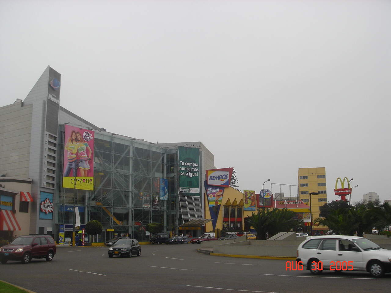 El Óvalo Gutiérrez en el distrito de Miraflores, el 30 de agosto del año 2005. Principalmente se aprecian los locales de comida rápida Friday’s, Bembos y McDonald’s con sus antiguas fachadas, que cambiarían varias veces durante los siguientes 20 años. En el Cineplanet destaca un aviso de intriga de la llegada de Vivanda, que abriría a finales del mes siguiente su primer local en la Av. Pezet, reemplazando como de costumbre a un Santa Isabel; además se ve una publicidad de Cyzone.