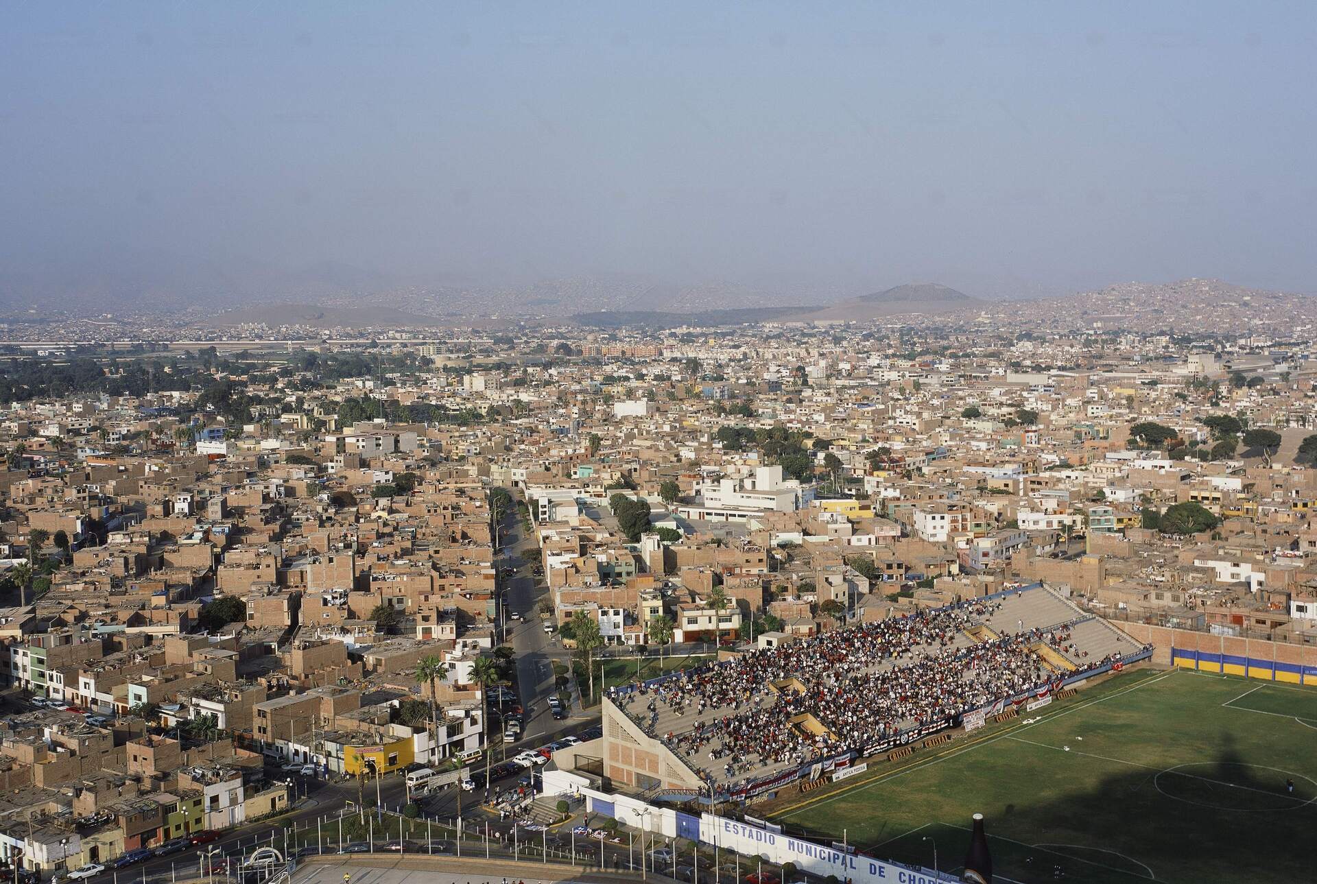 Gran panorámica que abarca en gran parte el distrito de Chorrillos, tomada desde el Morro Solar para el lado cercano del estadio municipal. No tengo la fecha exacta de la foto, pero debe haber sido tomada aprox. entre noviembre de 2004 y julio de 2005, por un detalle a notar: al centro y al fondo, se puede ver el hipermercado Metro del distrito con el logo de 2004 pero todavía con la fachada antigua, cuando ni siquiera la habían pintado al amarillo claro de los locales renovados (para una visión mejor dejo un zoom en spoiler abajo). A mediados de 2005 inició la construcción de Plaza Lima Sur, y abrió en diciembre de ese año.