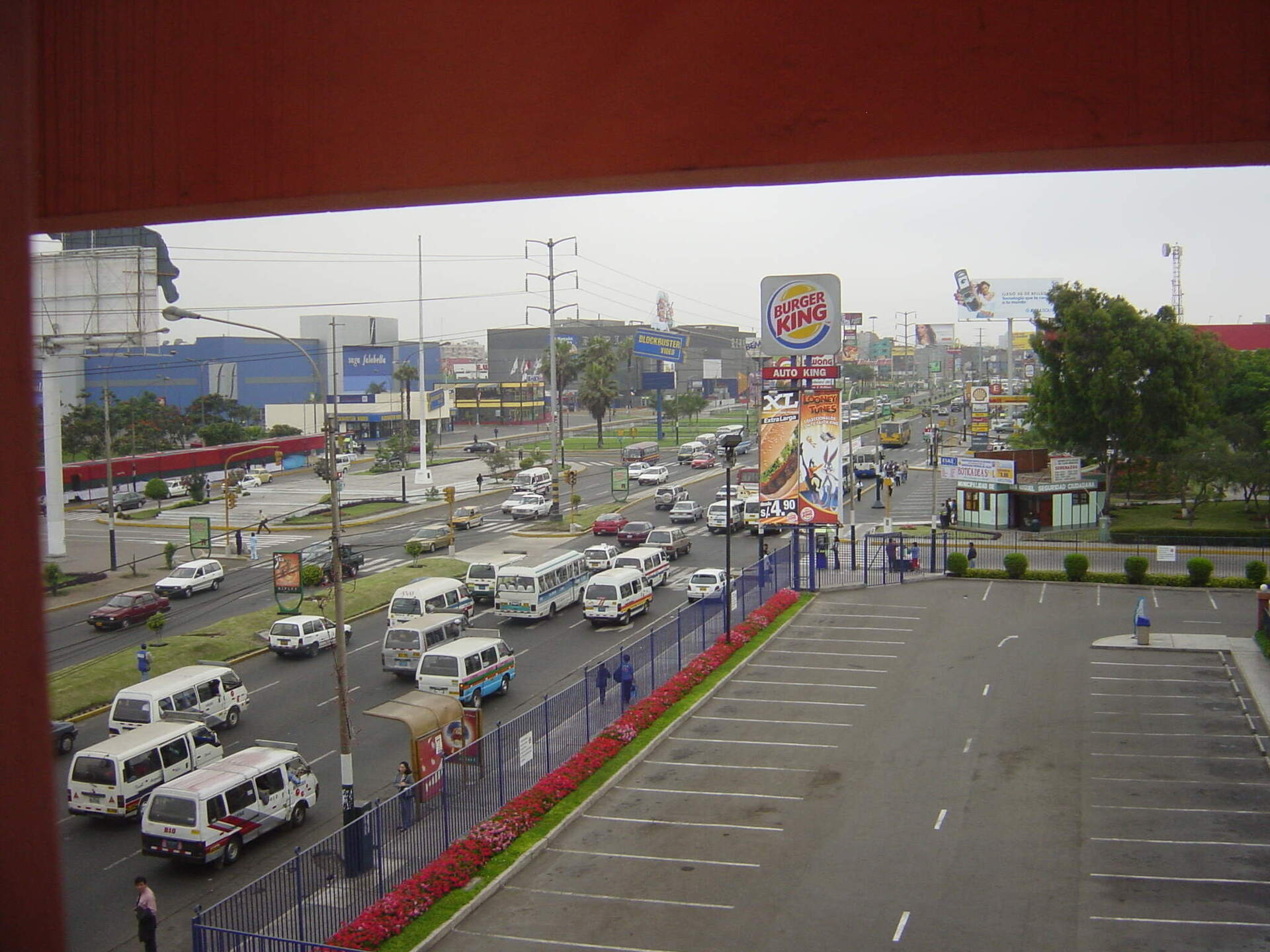 La Av. La Marina cerca a la intersección con la Av. Riva Agüero en el distrito de San Miguel, en diciembre del año 2003. Esta es una de las zonas que comercialmente ha cambiado mucho desde entonces. De cerca se aprecia el desaparecido Burger King de la esquina con Dintilhac (hoy un concesionario Nissan) cuando aún era un local stand-alone único, con la promoción de la por entonces estrenada Looney Tunes: De Nuevo en Acción. Cruzando la intersección, a la izquierda Plaza San Miguel con las viejas fachadas de Saga Falabella y Ripley, y con los antiguos locales de Blockbuster y Bembos, hoy todo tapado por un enorme edificio de tiendas. Al fondo el tótem retirado de KFC y Pizza Hut con sus viejos logos y el infame McDonald’s, junto con una publicidad de Unique. A la derecha, otra publicidad del nuevo 3G de la desaparecida Bellsouth, el antiguo Shell (hoy Primax) y parte del Santa Isabel que hoy es un casino. Créditos a Clark and Arlene’s: Amazon Adventure.