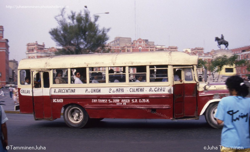 Foto del Centro Histórico de Lima en 1989, donde se muestra un micro de la extinta E.T San Juan Bosco S.A