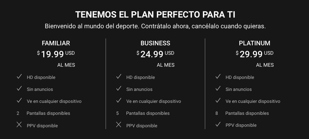 El servicio estaría disponible desde el próximo 30 de agosto con tres paquetes: familiar, business y platinum. Los costos irán de los 20 a los 30 dólares al mes, no contará con anuncios publicitarios y todos los eventos serán transmitidos en HD. Además estará disponible para dispositivos iOS,Android, laptops y equipos de escritorio.