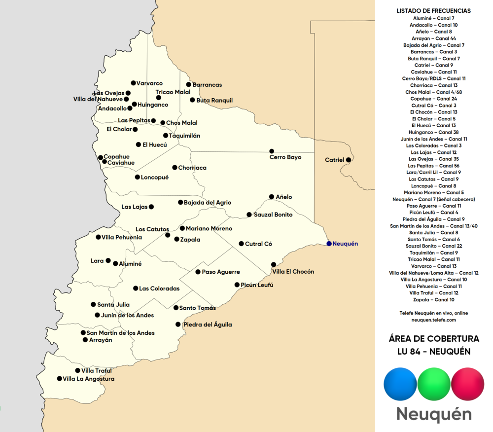 Les dejo un mapa que hice de las ciudades, localidades y parajes donde se encuentran la señal cabecera y las repetidoras de LU 84 TV Canal 7 (Telefe Neuquén). La información utilizada fue sacada de los Anuarios Estadísticos de la Provincia del Neuquén y de un mapa oficial de Canal 7 de Neuquén (el cual no subo porque no es buena su calidad de imagen). El mapa utilizado fue sacado de Wikimedia Commons.