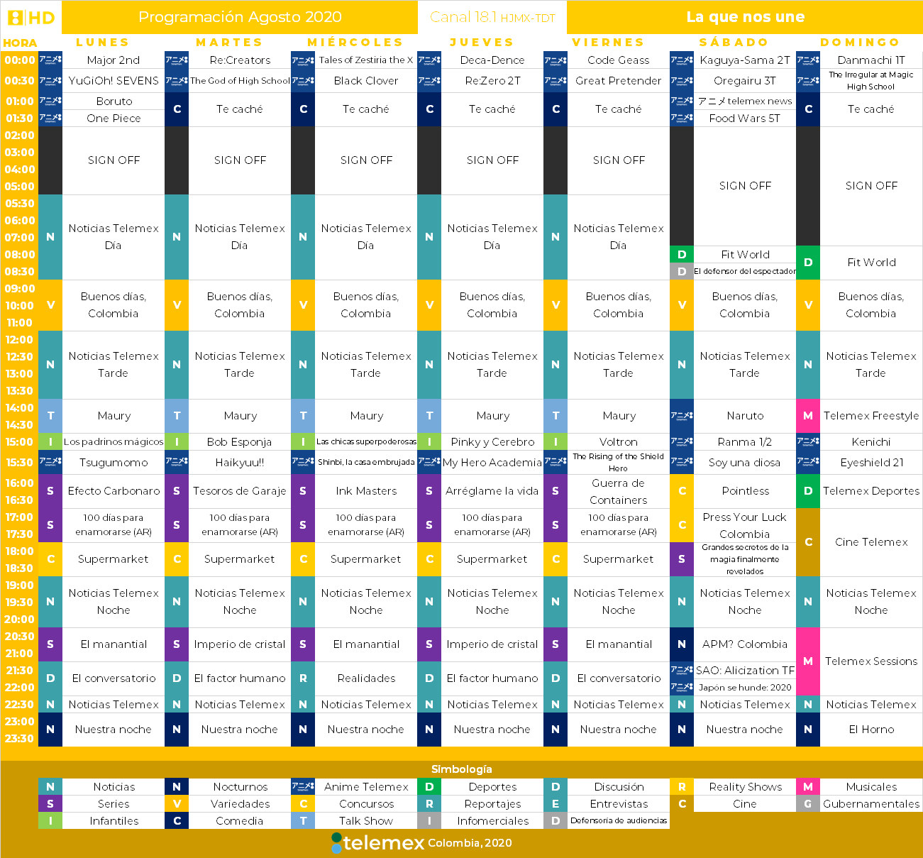 ***Descripción de la emisora: ***Telemex es un canal generalista con enfoque juvenil, con el objetivo de tener una programación imparcial, libre, sin censura e independiente para la población colombiana. Dentro de su programación se pueden encontrar programas de noticias, variedades, series, novelas, deportes, anime, infantiles, concursos, cine y musicales.