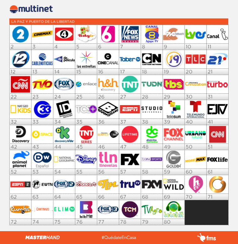 Esta es la parrilla de canales actual de Multinet, cuyo servicio está disponible en el Depto. de La Paz y la zona costera del Depto. de La Libertad. La grilla corresponde al servicio analógo, aunque también cuentan con servicio digital pero desconozco cuales son los canales que incluye.