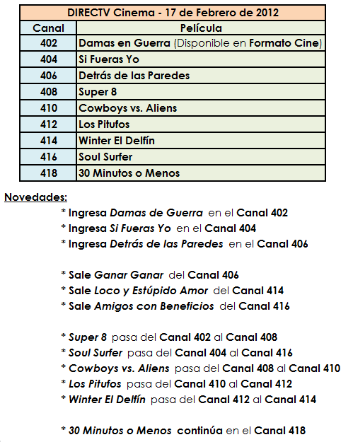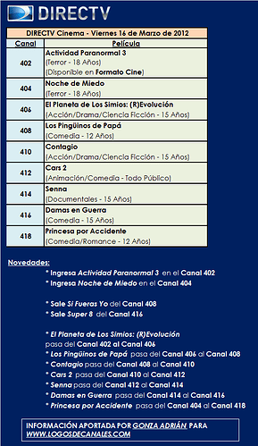 [b]Programación de Películas de DIRECTV Cinema (PPV), a partir del 16 de Marzo de 2012.