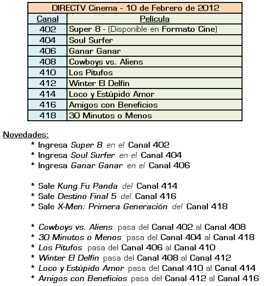 Programación de Películas de DIRECTV Cinema (PPV) - (Cambios Respecto al 30/03/2012), a partir de día 09 de Abril de 2012