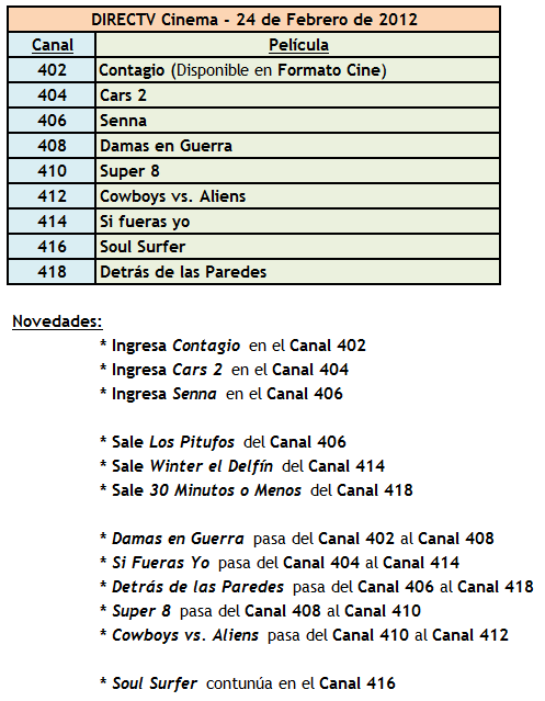 Yo no quiero ser malo, y por eso no dije nada antes, pero estos post que haces todas las semanas no tienen mucho sentido para el foro.. osea brinda info, pero tal vez poco necesaria porque los que no tenemos Direc Tv no nos interesa y los que tienen DirecTv con las peliculas esas compradas ya saben que dan..