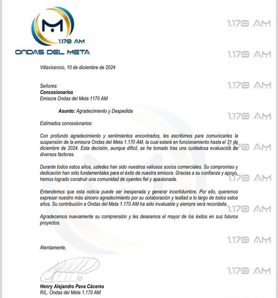Atención: La emisora Ondas del Meta, cerrará sus emisiones el 31 de diciembre, la frecuencia 1170 AM, será entregada al Ministerio de las TIC.