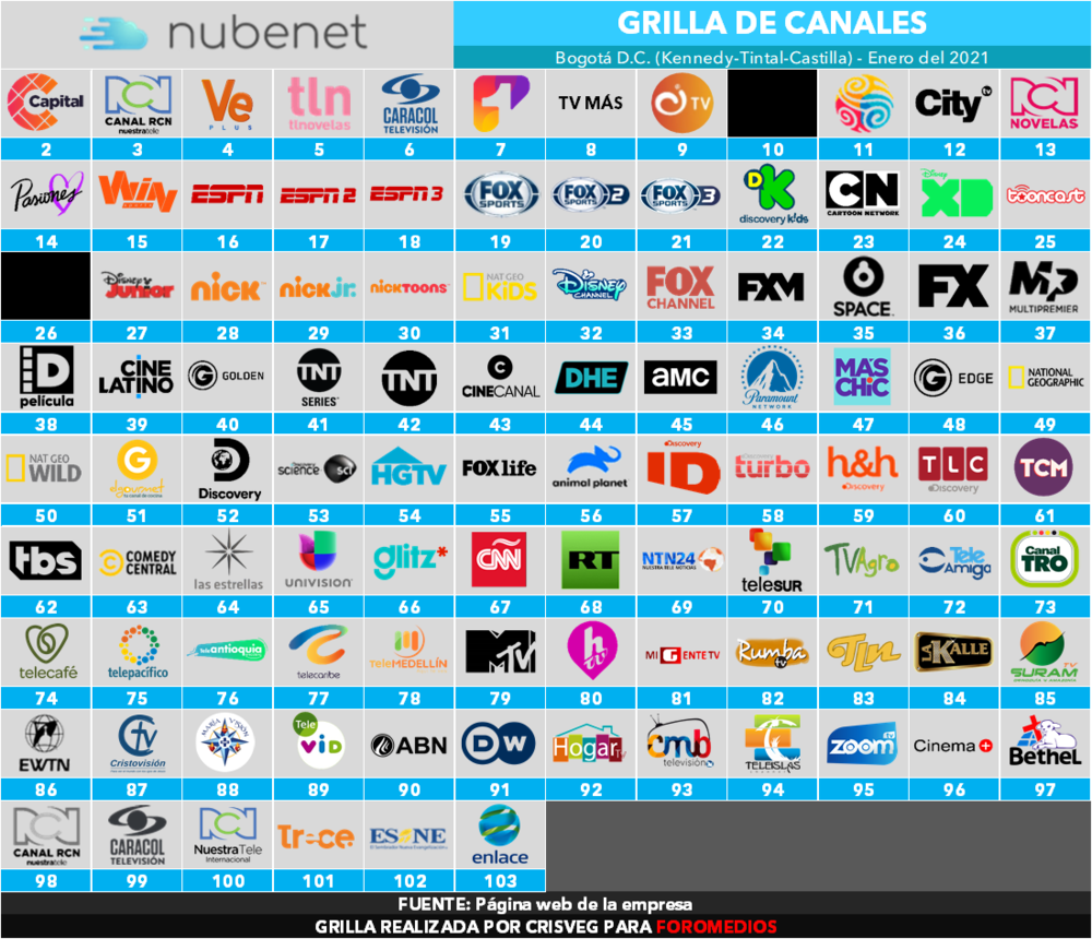 También es curioso que pongan a RCN y Caracol estratégicamente justo donde no les puedan caer interferencias (3 y 6), y de todas formas los dupliquen al final de la parrilla...