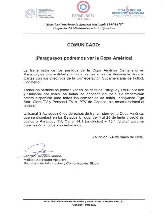Fuente: [Última Hora](http://www.ultimahora.com/paraguay-tv-y-unicanal-transmitiran-la-copa-america-n993995.html)