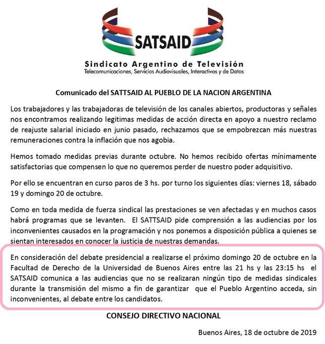 Seguramente sea para que se note que hay paro. Creo que no estaría bueno que paren ese día porque así como la gente tenía derecho a escuchar el debate, también tiene que tener las transmisiones de elecciones bien hechas, sin hacerlo así nomas ya que es un tema importante.