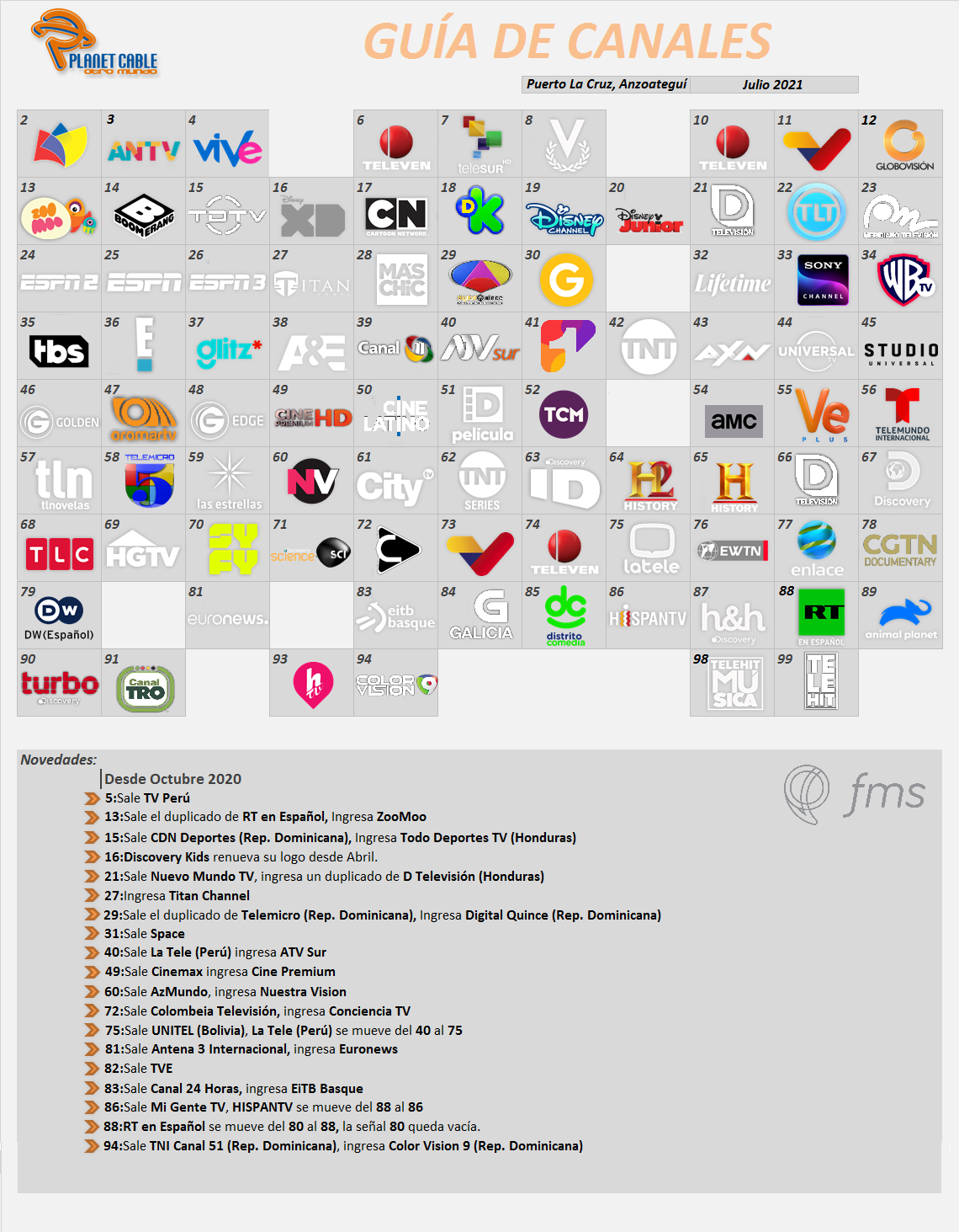 Planet Cable (Puerto La Cruz) - Grilla de canales - Julio-Agosto 2021