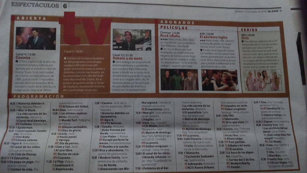 Incluye los destacados de ese día en tv cable y la programación de la Red Uruguaya de Televisión (abreviada como RTC) y VTV. Saludos!