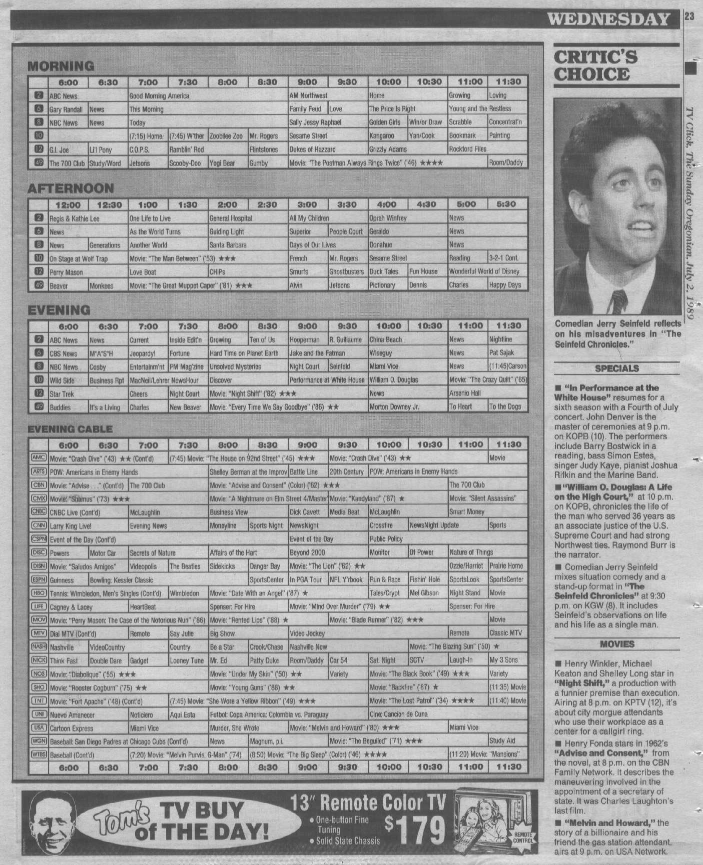 Programación de TV de Portland (Oregón, EE.UU.) - Miércoles 3 de julio de 1989