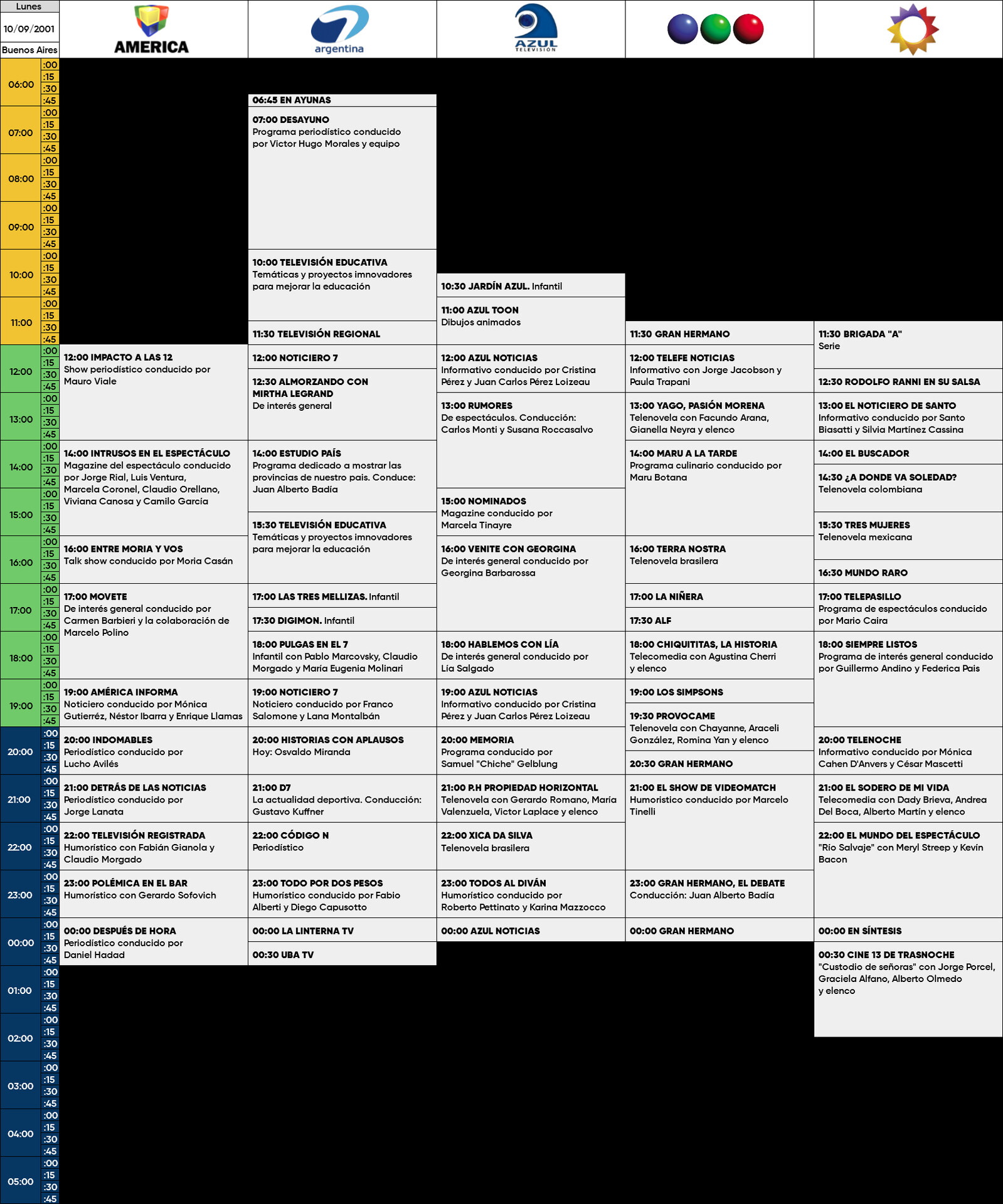 Programación TV Abierta Buenos Aires - Lunes 10 de Septiembre de 2001