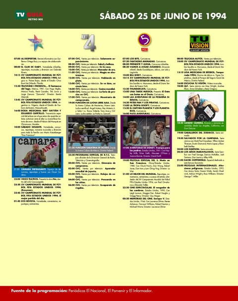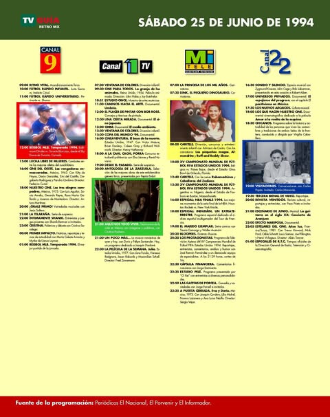 Asi era la TV Mexicana un sábado 25 de junio de 1994, En esa fecha del Mundial de Estados Unidos, se he dado el infame último partido de Diego Armando Maradona donde Argentina gano 2 a 1 ante Nigeria antes de hacer una prueba antidoping hasta ser expulsado del torneo por 2 días. también ocurrió la boda de Biby Gaytán y Eduardo Capetillo en la Hacienda del Palacio del Marqués, en Chiconcuac, Morelos que fue vista por más de 800 millones de espectadores según TVyNovelas, convirtiéndose en una de las bodas más mediáticas entre artistas en la historia de Televisa.