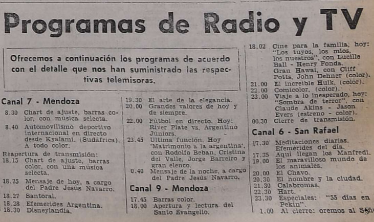 Por aquel tiempo, los canales mendocinos transmitían menos horas (alrededor de seis) durante enero y febrero para poder darle vacaciones a su personal. Esa costumbre perduró hasta principios de los '90. El año pasado lo contó en una nota Mariano Alonso (presidente de Cuyo Televisión, licenciataria del 9 Televida) por el 60° aniversario de la emisora.