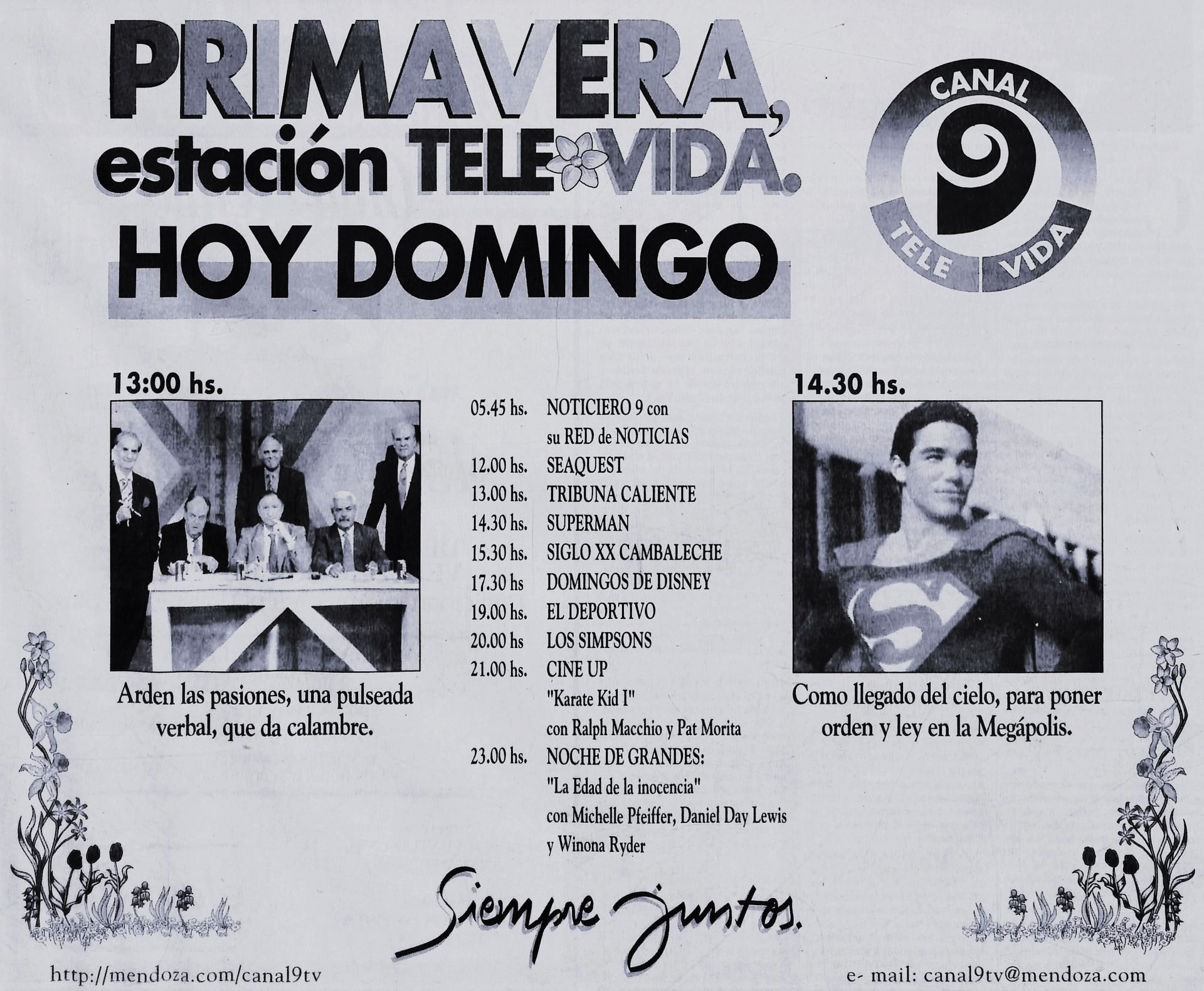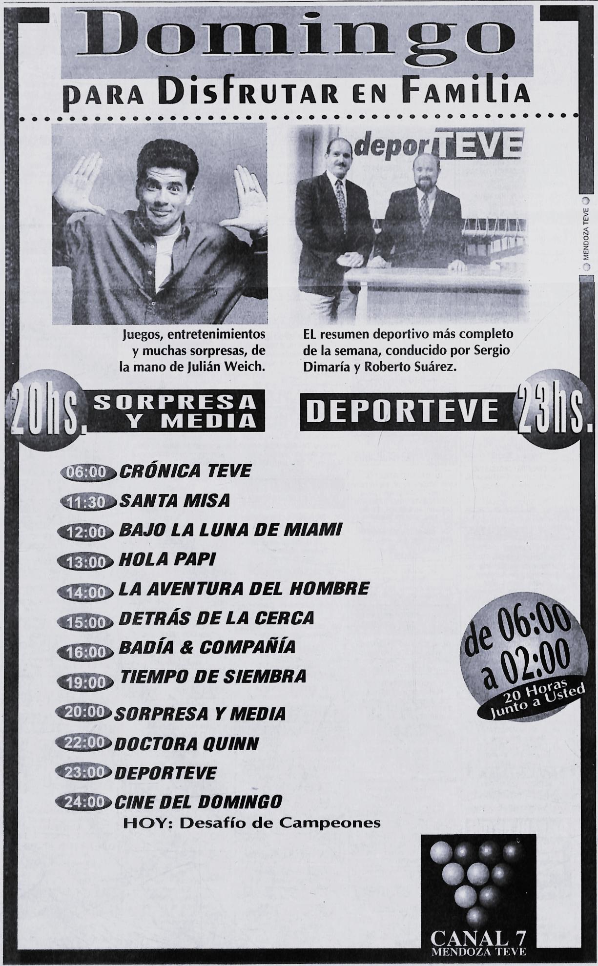 BONUS: los avisos de Mendoza TEVE y Televida con sus respectivas grillas de la jornada. Por aquellos años, los canales 7 y 9 publicaban avisos de este cariz todos los días para detallar su programación en una manera visualmente atractiva.