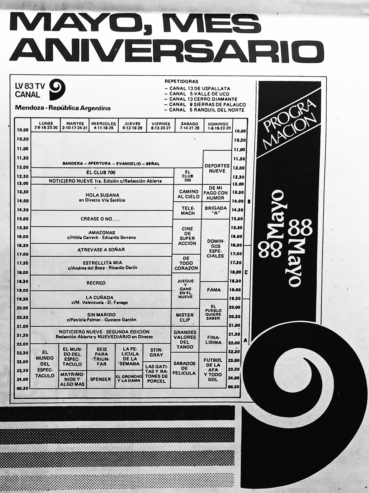 El programa de Susana pasó al Canal 9 de Buenos Aires en 1988. En Mendoza, del 7 se fue al 9, que lo emitía “en directo y vía satélite”, según este aviso de mayo de 1988.
