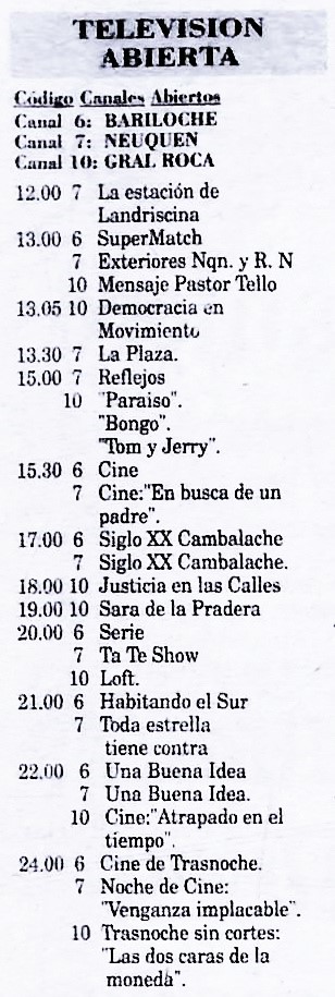 Programación TV Río Negro: Sábado 30 de octubre de 1993