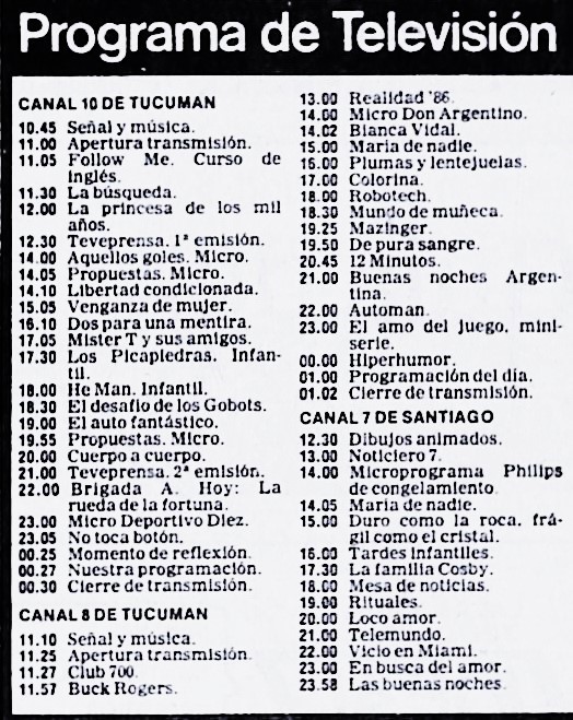 Programación TV Tucumán: Lunes 27 de octubre de 1986