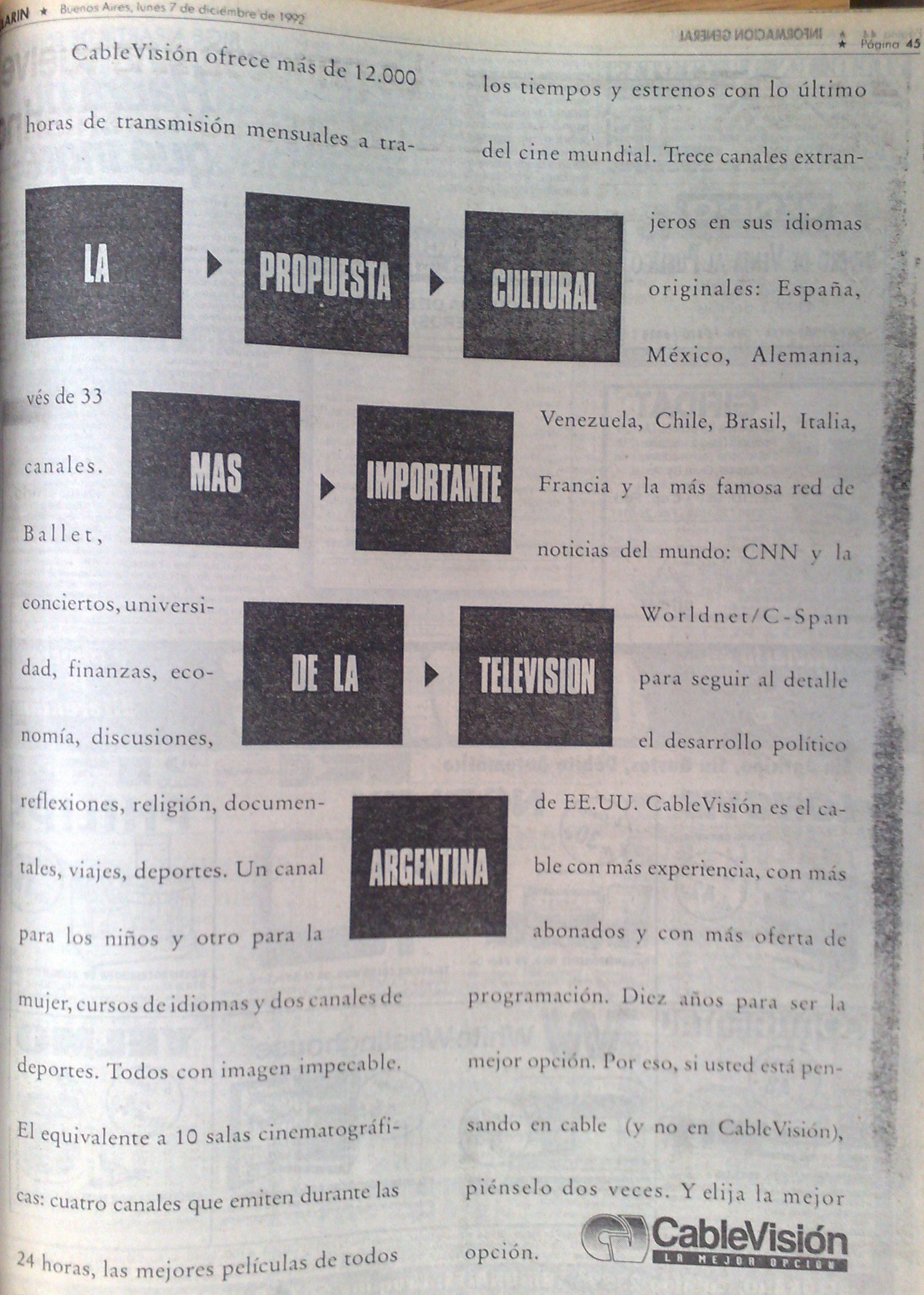 despido el año compartiendo esta publicidad grafica de cablevision capturada del diario clarin del dia lunes 7 de diciembre de 1992