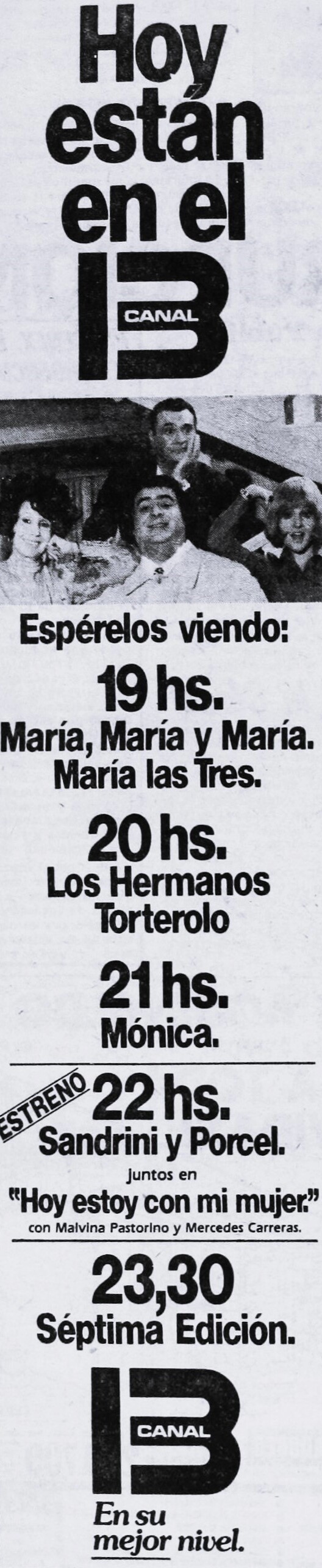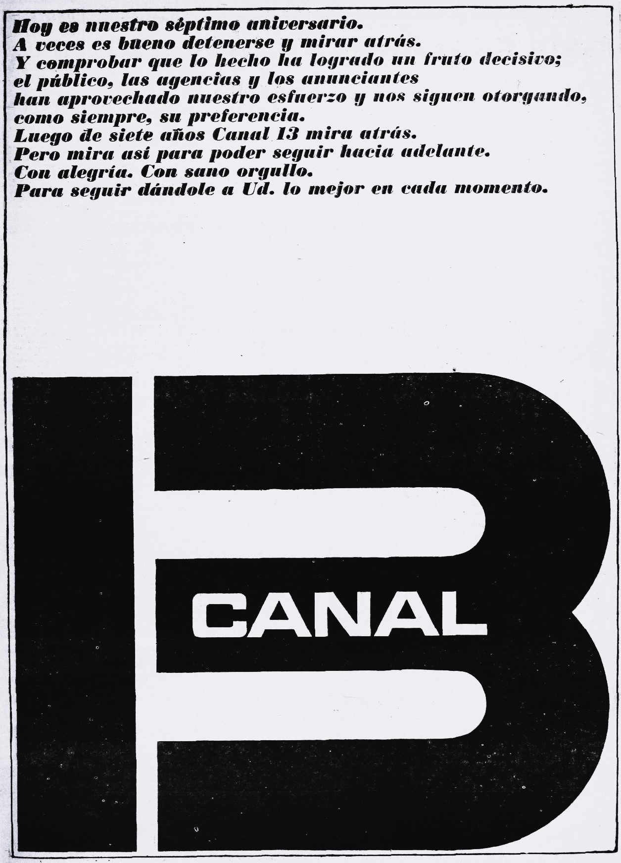 Dos avisos de cumpleaños del 13: uno de octubre de 1967 (7° aniversario) y otro de octubre de 1970 (10° aniversario). Además, uno de julio de 1980 resaltando su programación de horario central. Tomados de los diarios Crónica y Clarín.