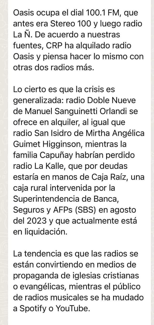 El cierre de Oasis y la venta de los 100.1 FM de Lima confirma los rumores de que CRP se encuentra en una delicada situación económica. Esto ya venía trascendiendo desde 2020-2021.