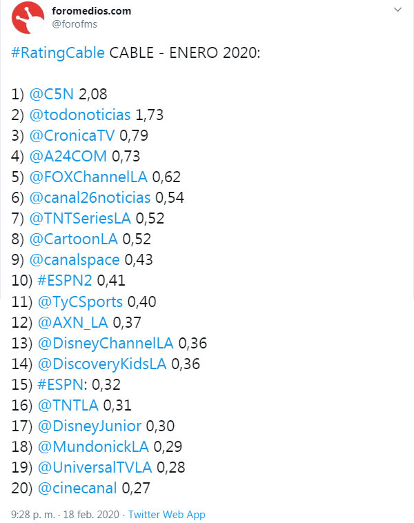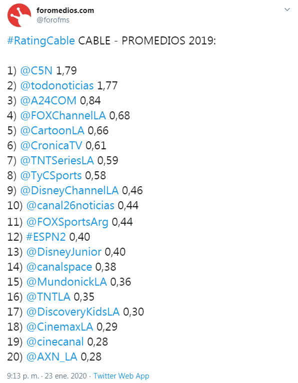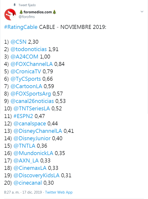 ezequiel kees: igual yo esperaria ver que nos ofrece america con los programas de media pro y el nueve con grupo octubre, sera interesante esta disputa por el 3er lugar en 2020