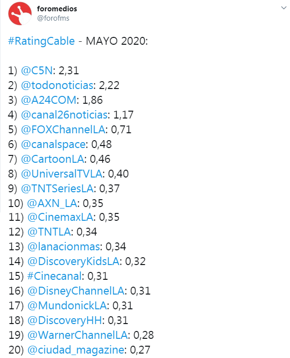 Además de lo parejo que quedó TN con C5N (*****), siguen afectados los canales de deportes con la ausencia de partidos (salvo "ESPN 2" que emitió buenos partidos y apareció entre los 20 más vistos).