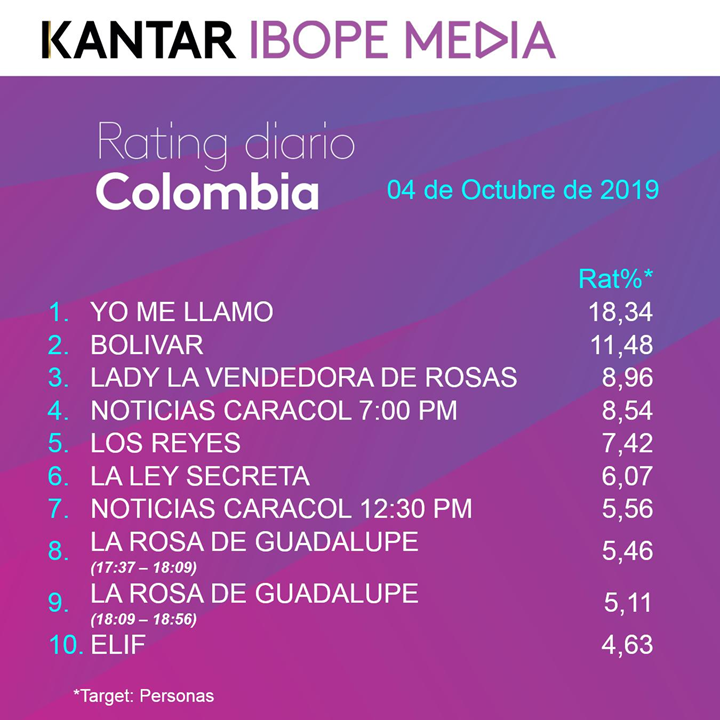 'Yo me llamo' del Canal Caracol continúa consolidado como el programa favorito de los colombianos, mientras que 'Bolívar' decreció en rating respecto al día anterior. Por los lados del Canal RCN, 'Lady, la vendedora de rosas' es el producto más visto, superando a su enfrentado 'Las Muñecas de la Mafia 2' el cuál se quedó prácticamente sin anunciantes: en las tandas publicitarias casi todos los programas pertenecen a Caracol Televisión. En cuanto a las tardes, 'La Rosa de Guadalupe' (RCN) lideró el horario de 4 a 7 de la noche, superando a sus tres enfrentados de Caracol.