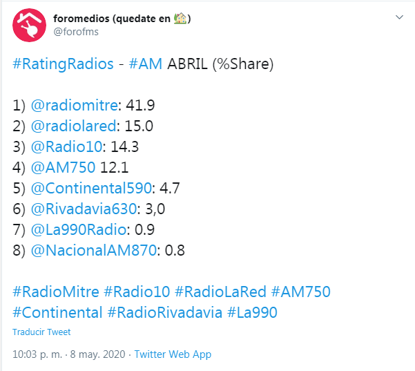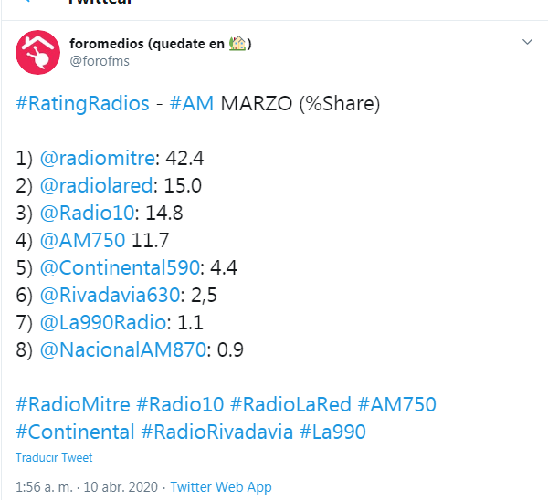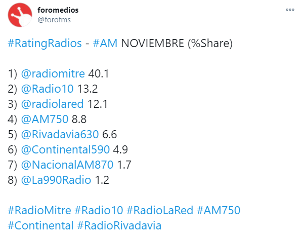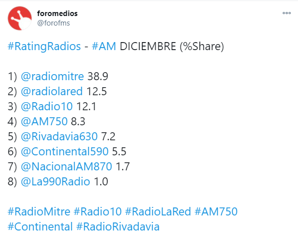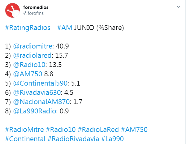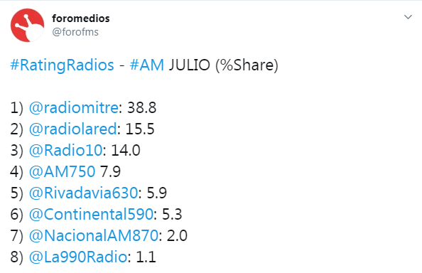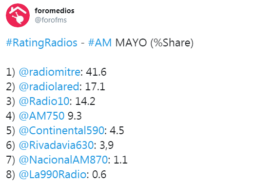 Se destaca "Radio la red" que le sacó el 2do lugar a "Radio 10" y aparece, en el 8vo lugar, "Radio Nacional" (AM 870)
