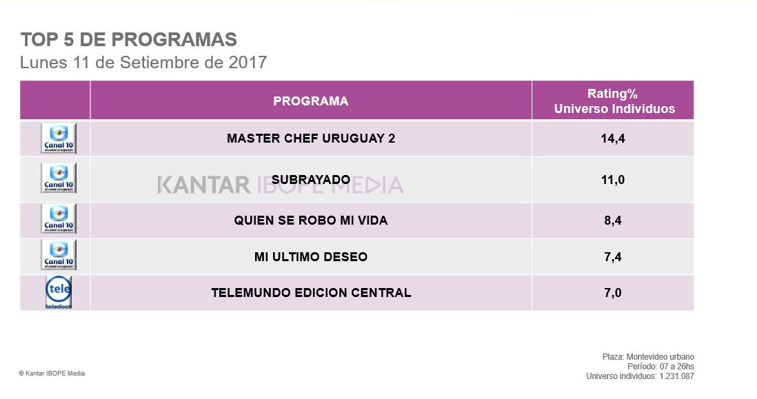 Showmatch (Teledoce) y Subrayado (El noticiero del 10) lo más visto. Escape Perfecto baja un poco pero no mucho y TNU triunfa con un programa del cual quizá no se esperaba demasiado, el periodístico "Moros y cristianos" (Llegó a 2.0 de rating según Kantar IBOPE Media superando la media del canal).