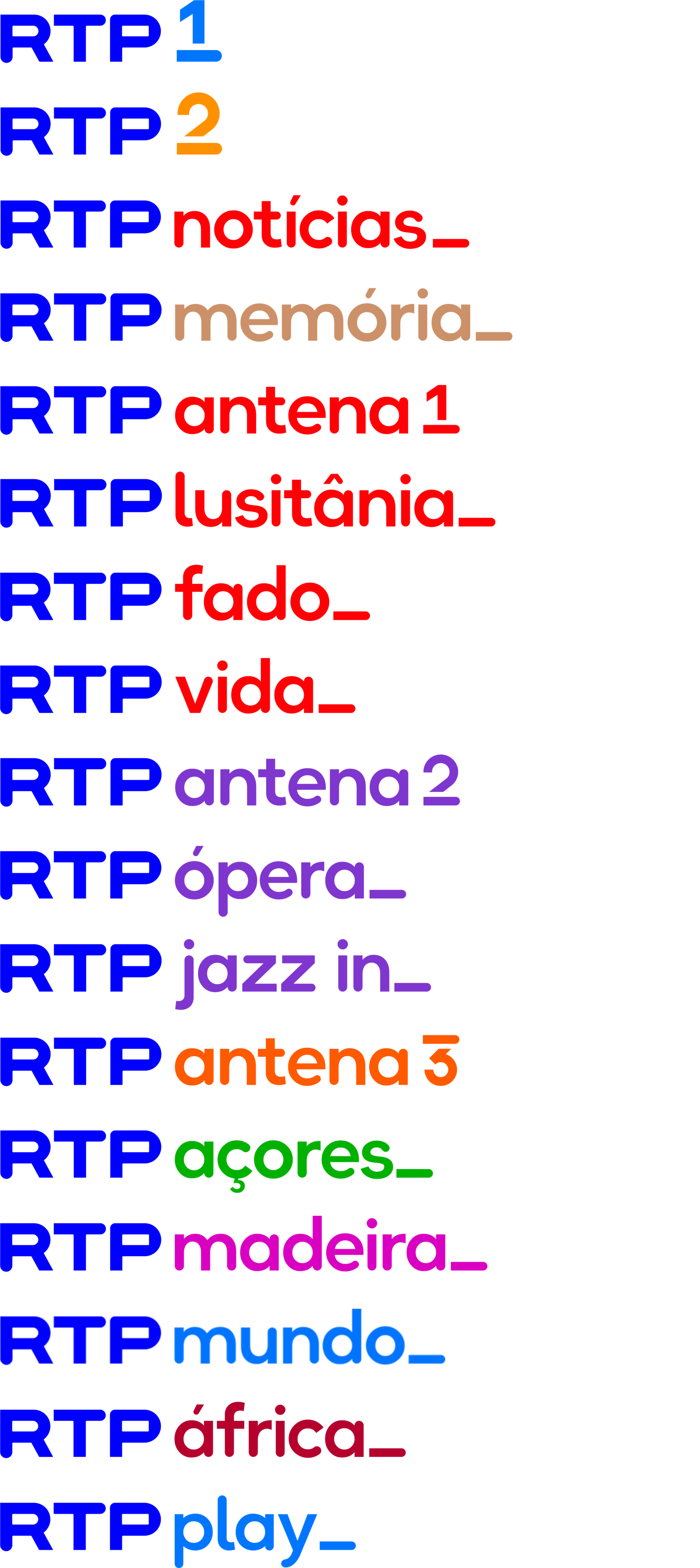 Todas las estaciones adoptan el nuevo wordmark RTP que ya se ve en RTP, aunque en color azul; además, cada canal mantiene una clave de color similar a la que ya tenían previamente, aunque algunos de ellos cuentan con cambios: por ejemplo, RTP Memória ahora usa un tono en oro en lugar de plata, y RTP1, RTP Mundo y RTP Play ahora usan el mismo tono azul cielo.