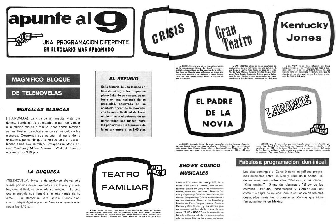 Según Arkiv Perú, su eslogan era "Apunte al 9". Tenían telenovelas, series y programas cómicos.