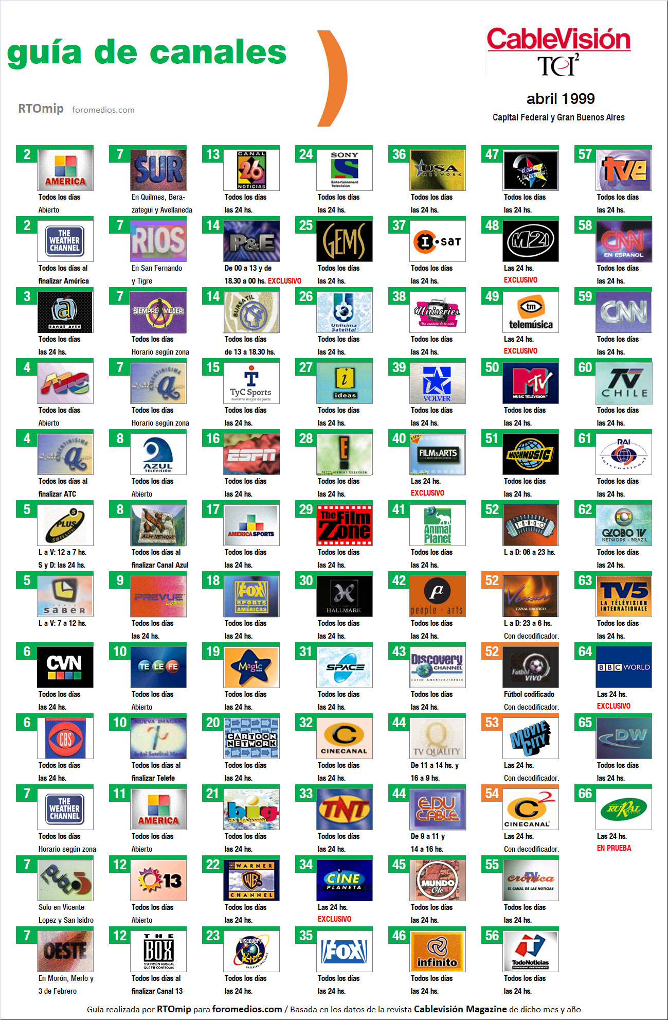 Retomamos este viaje en el tiempo a fines de los 90, y esta vez toca el turno de la guía de canales de Abril de 1999. La razón de mi parate de unos días fue que se me habían terminado las grillas que tenía ya hechas allá por el 2021, y tuve que retomar el armado de las que me quedaban, por lo que van a notar algunas diferencias estéticas con respecto a las anteriores.