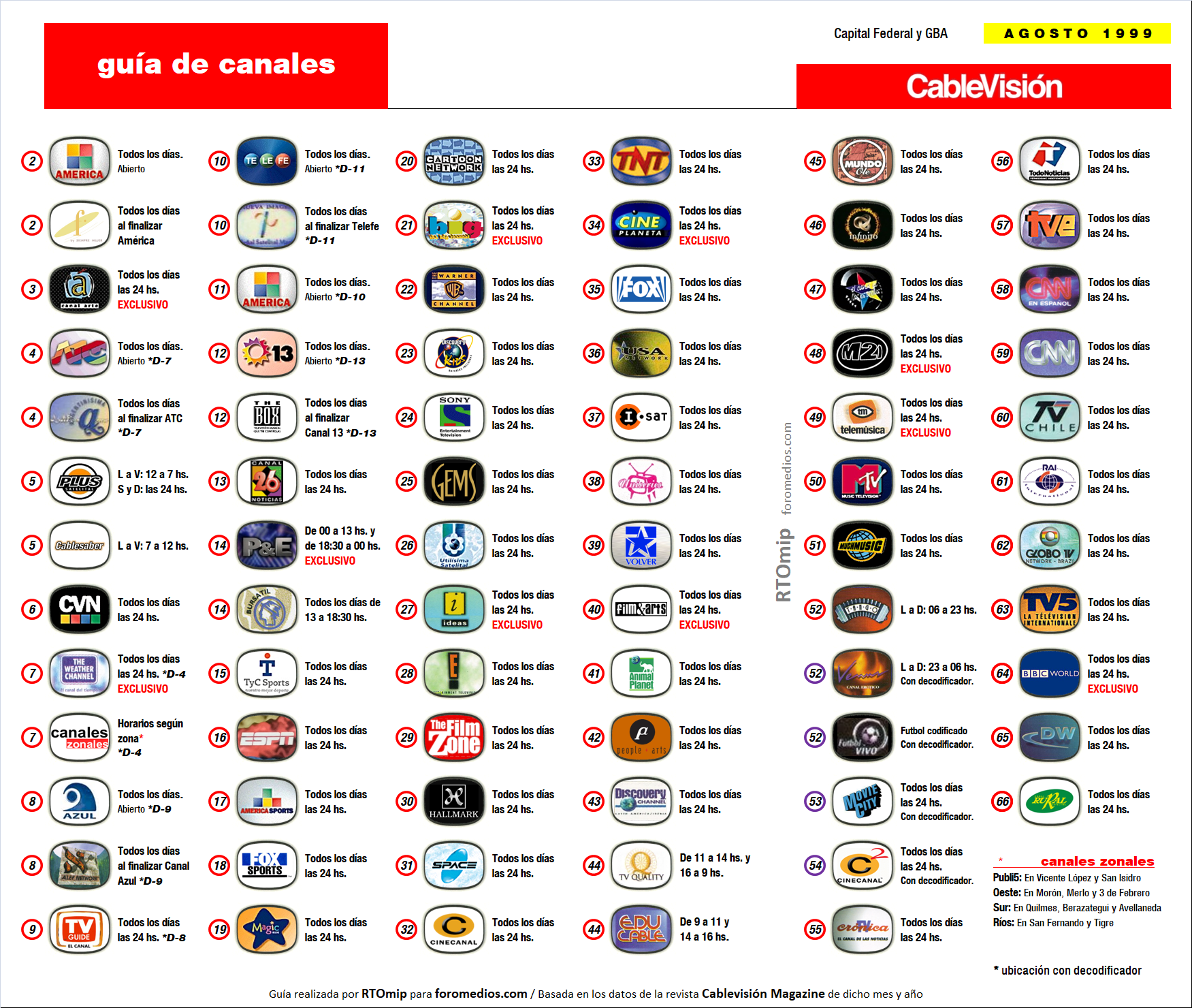 Si no me equivoco (con los datos que he recabado), al momento de esta grilla (1999), Cablevisión seguía siendo de TCI/HTM&F con América/Pramer como principales aliados y que el que era de Clarín/Artear era Multicanal, en MC TN siempre estuvo hasta la fusión de 2007 en el canal 14, mientras en CV estuvo en numeraciones altas (56, 60, 64) hasta 2004(?) cuando finalmente pasa a la parte baja (canal 9).